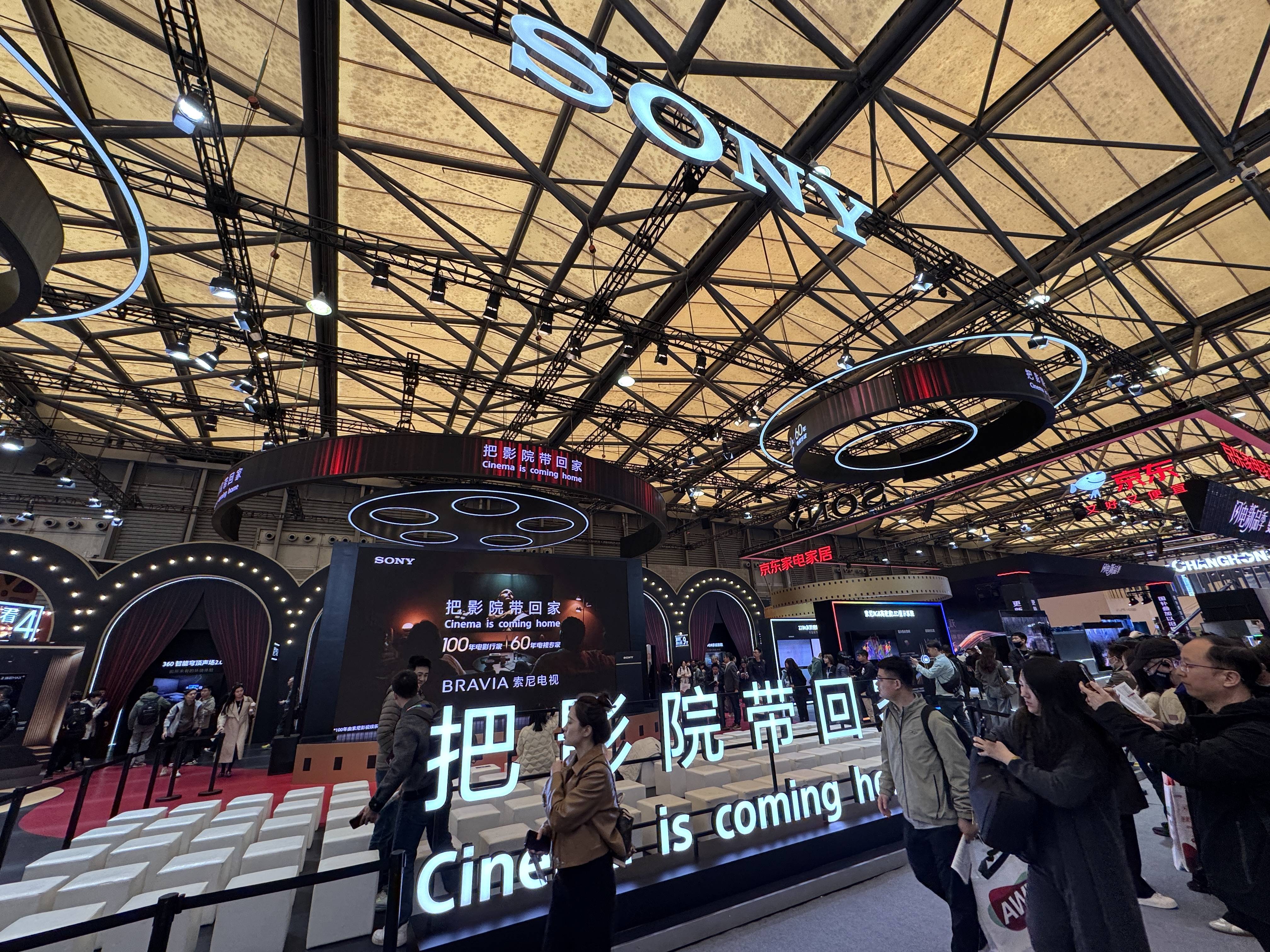 先来看看索尼吧,杰夫视点这次也是受邀参加了索尼在AWE第一天的发布会。索尼的展台其实布置得很有特点,虽然面积不算太大,但是充满了人文和历史的感觉。展出的产品都是已有的产品,比如去年的9系、7系Mini LED电视以及8系OLED电视,同时还有索尼自己的一些回音壁产品和投影仪。当然索尼更多也是在介绍自己在Mini LED电视上的一些技术,比较有意思的应该是HX3110这个双层LCD面板的监视器,这是目前全球最好的监视器。