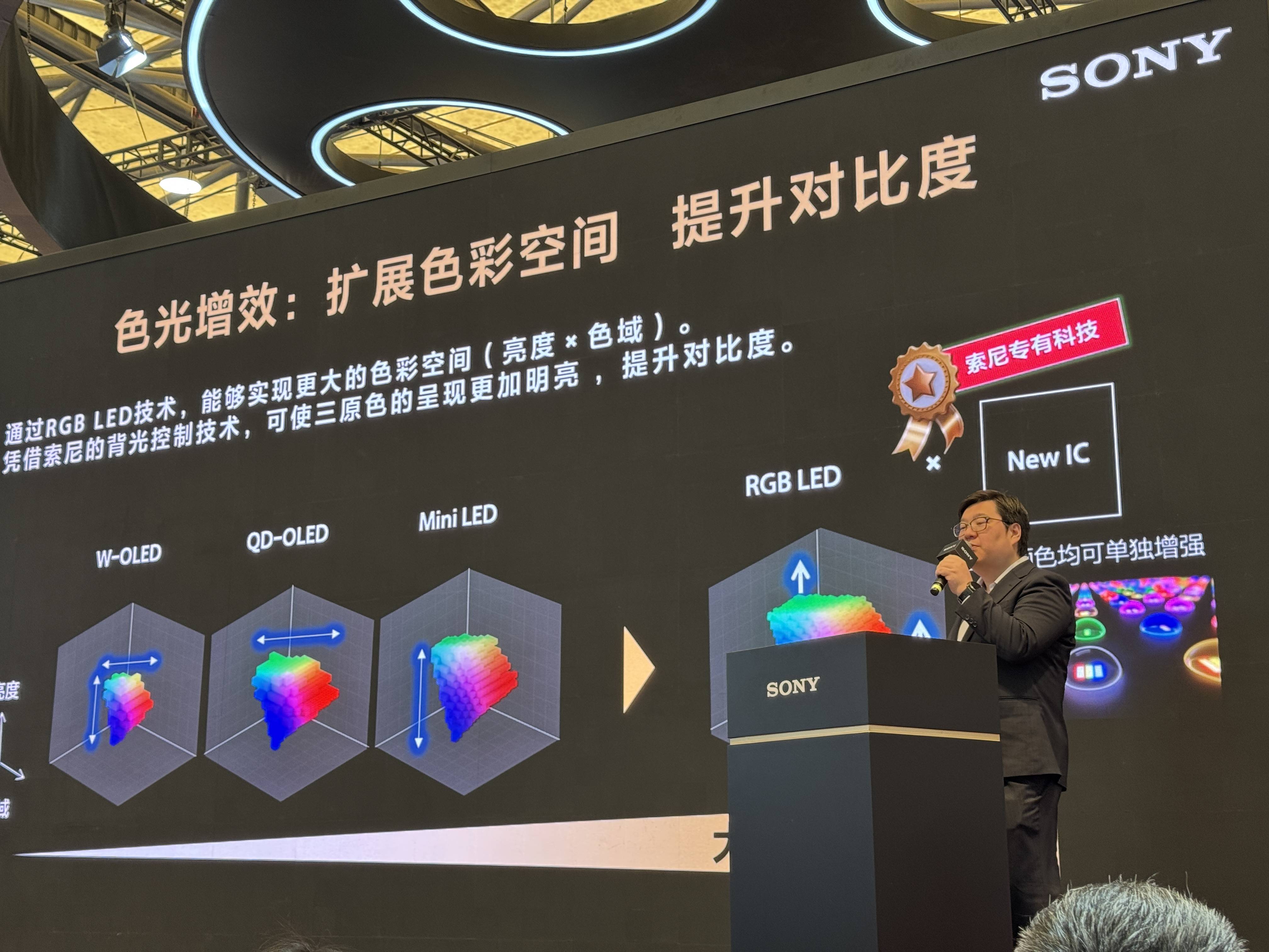 发布会第二部分也是最重要的部分,就是RGB Mini LED技术的发布了,这次索尼请来了日本首席工程师相马邦彦先生来进行发布和讲解,这位也是去年9系列的缔造者。内容部分其实和之前在东京发布的基本相同,当然这个技术在国内被称为RGB高密度LED显示系统。从索尼的角度而言,还是希望这个技术能在电视的色彩、对比度以及视角上进一步提升。其他包括90%以上的BT2020色域、4000nits峰值亮度以及2026年成品上市等,都是我们已知的内容了。