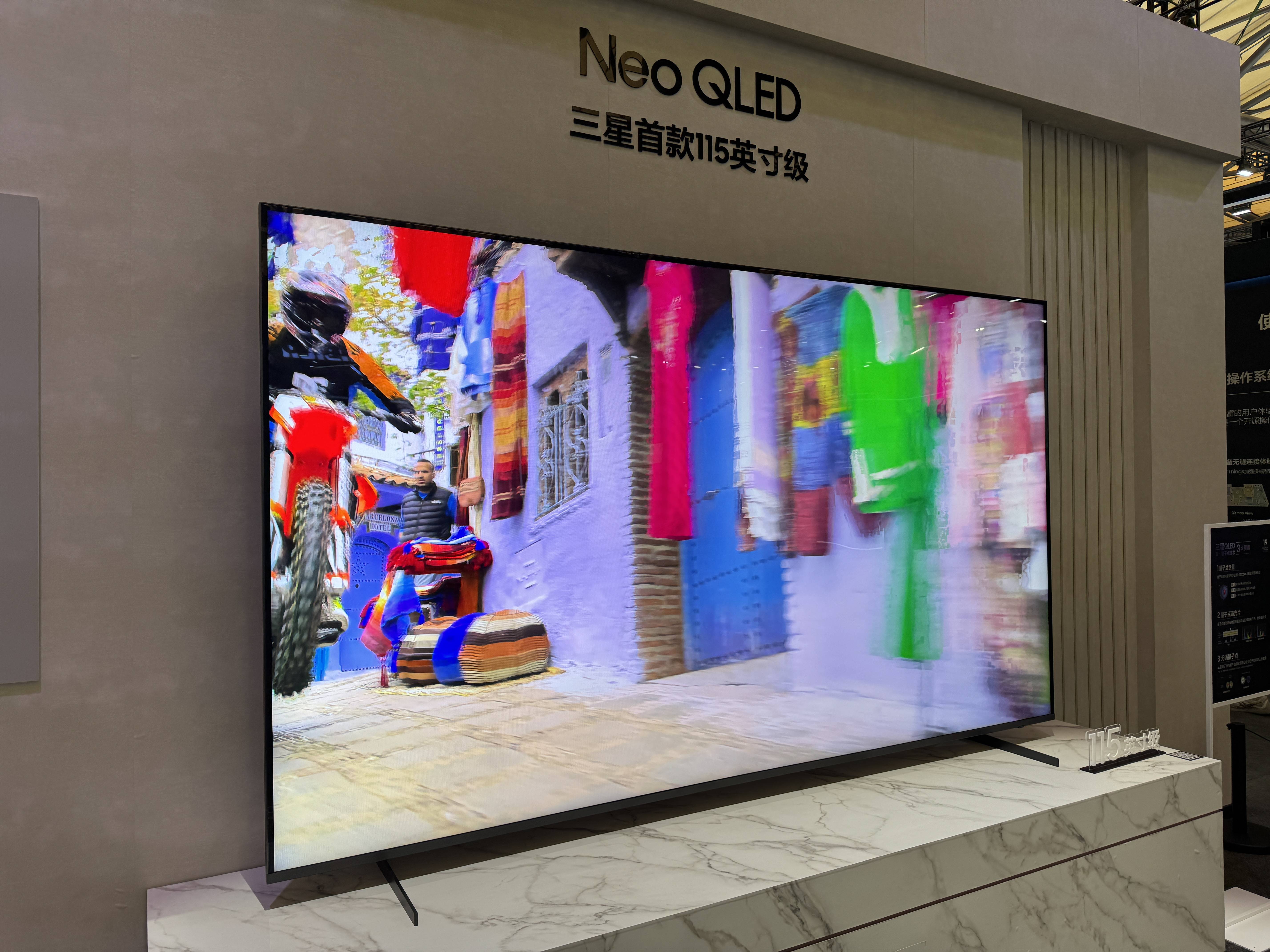 三星的其他电视,倒是能给我们带来视觉上的喜悦。比如Micro LED产品,除了有进化后的透明演示机之外,三星每年还是要继续推出不同尺寸的量产Micro LED电视。Micro LED电视基本可以算是无边框设计了,黑边也几不可见,现场的QN900系列也继续保持2.8mm的屏幕非显示区域。不过这对我们来说,并非什么新的体验,毕竟去年也是如此。如果说有什么新玩意的话,那么三星新的115英寸QLED电视肯定算,不过TCL既然之前已经抢先发布过相关产品,那么三星现在发布就少一点新鲜感了,毕竟大家都知道这是华星的115英寸HVA面板。