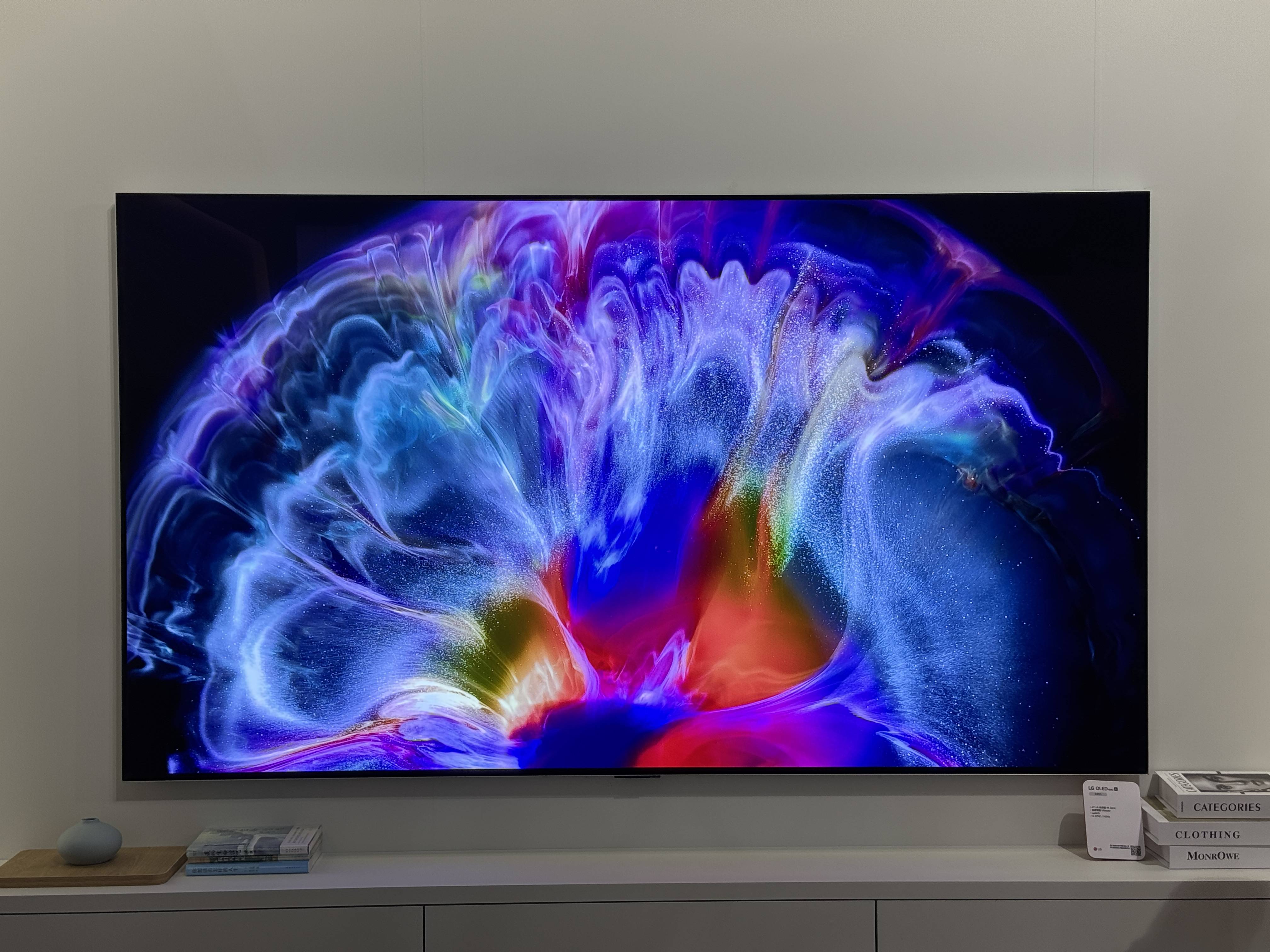 有点意外的是,这个83英寸采用了白色边框,黑边还是比较明显(看多了Q10L的后遗症……)。由于G5国内已经上市,基本情况大家都比较清楚了,比如说新的α11 AI芯片Gen 2、亮度增强器以及165Hz的刷新率等等。