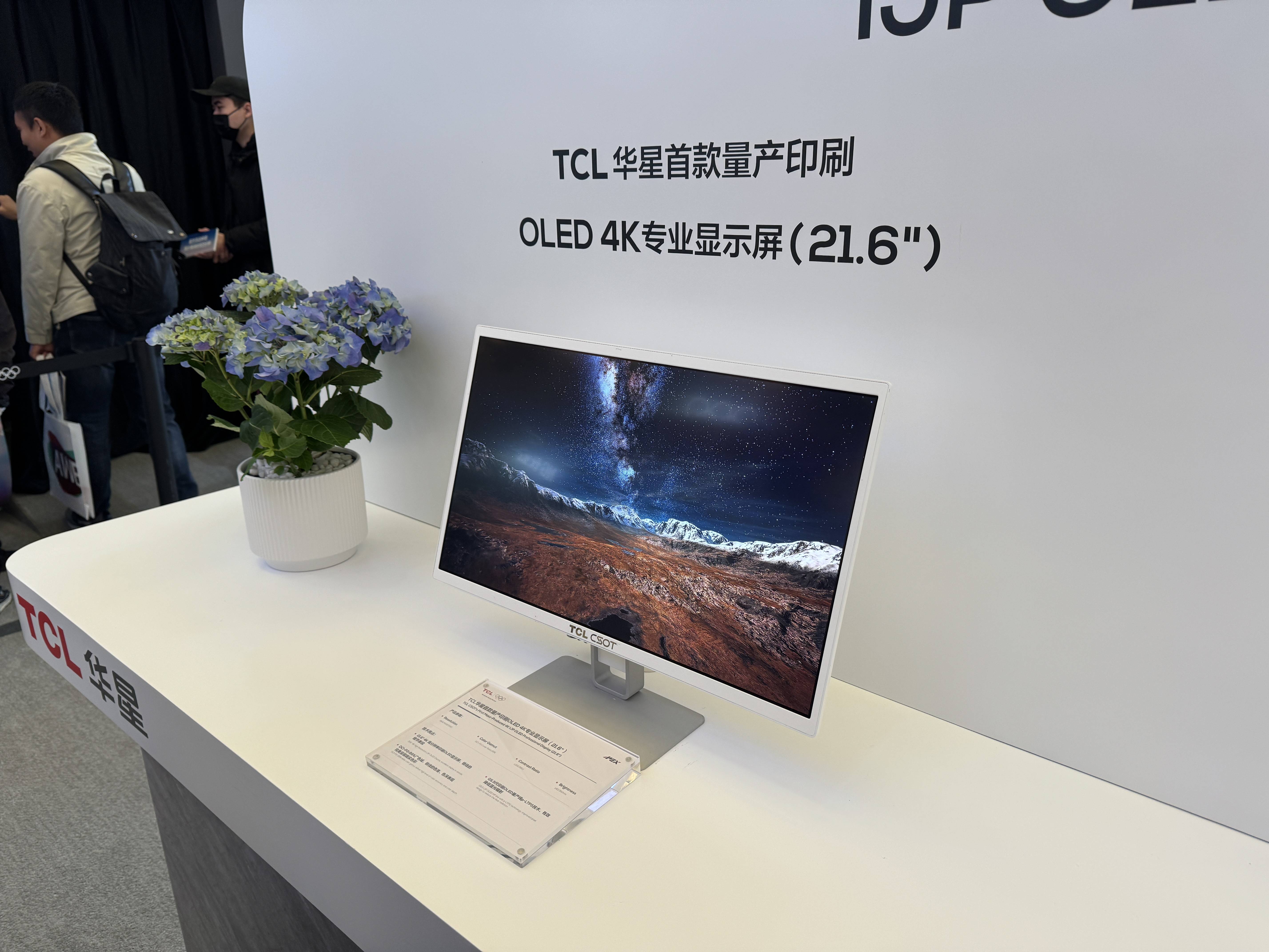 TCL华星部分,今年的区域感觉比去年小一些,依然是展示自己最新的显示技术。这部分最吸引人的自然还是IJP OLED面板了,去年华星展示了笔记本OLED面板和IJP OLED显示器的原型机,今年就要成熟得多了,不但有21英寸的IJP OLED展示机,同时也有27英寸的IJP OLED展示机了。华星27英寸的IJP OLED显示器面板,规格当然是4K/120Hz,目前全屏亮度能做到250nits,峰值亮度能做到600nits,加上拥有82%的BT2020色域,我们自己对使用这款面板打造的游戏显示器是相当期待的,只要价格合适,应该能在目前被三星和LG垄断的电竞OLED显示器市场上,杀出一条血路来。