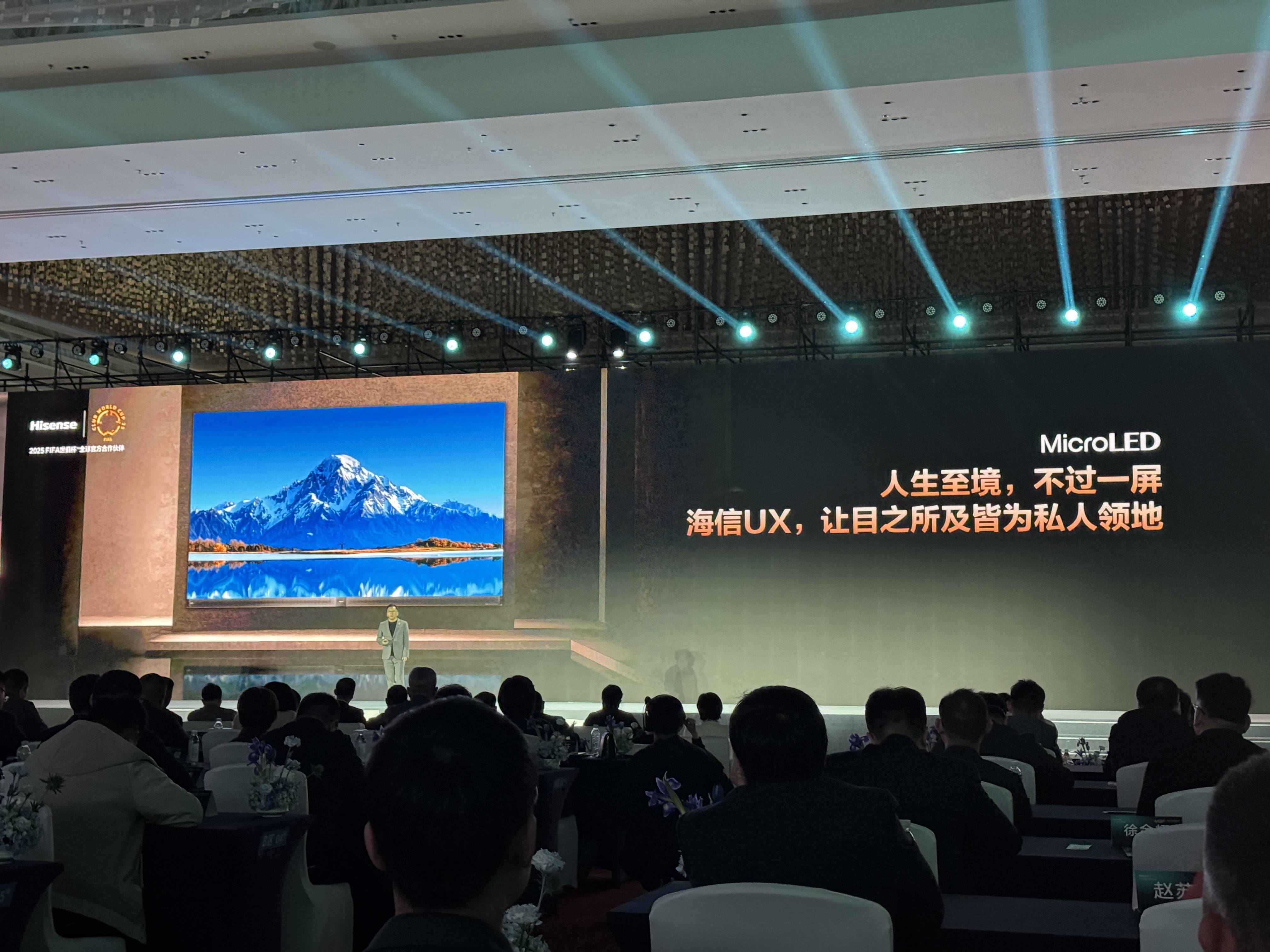 最显眼的当然是海信已经正式发布,并且即将上市的RGB Mini LED电视,也就是新一代的UX系列,这次海信直接在主舞台上放了三台116UX,同时在背光展示区域我们也看到海信RGB Mini LED电视,很显然RGB Mini LED电视对于海信来说,从产品、技术以及市场等多个角度而言,都非常重要。在海信第二天的“此刻是我”世俱杯新品发布会上,RGB Mini LED电视正式发布,新一代UX系列有85英寸、100英寸和116英寸三个版本,最低27999元起售,最高价格则来到了99999元,我们未来在拿到85英寸的UX后,会立刻进行测试,看看全球第一款RGB Mini LED电视的效果到底如何。