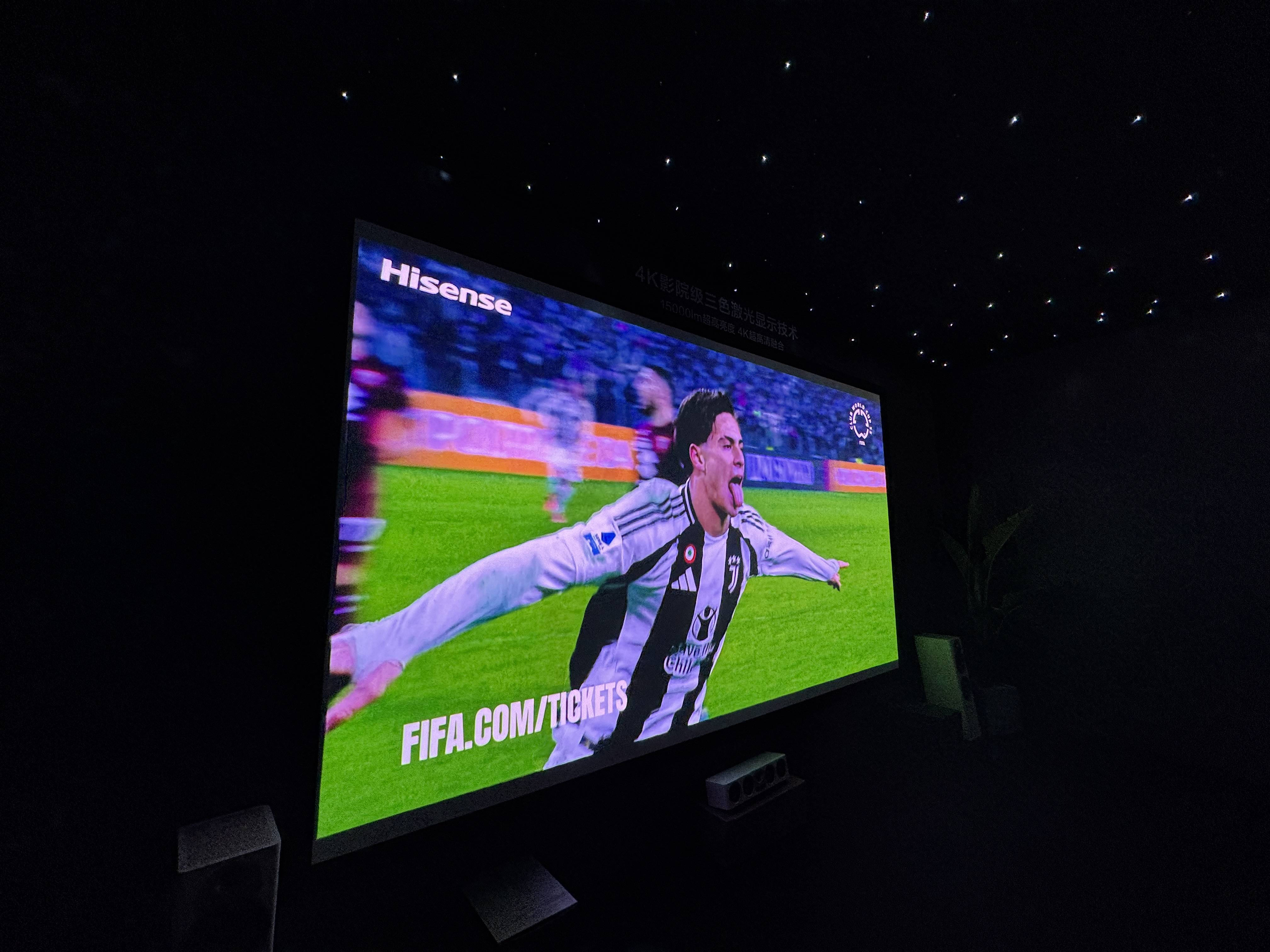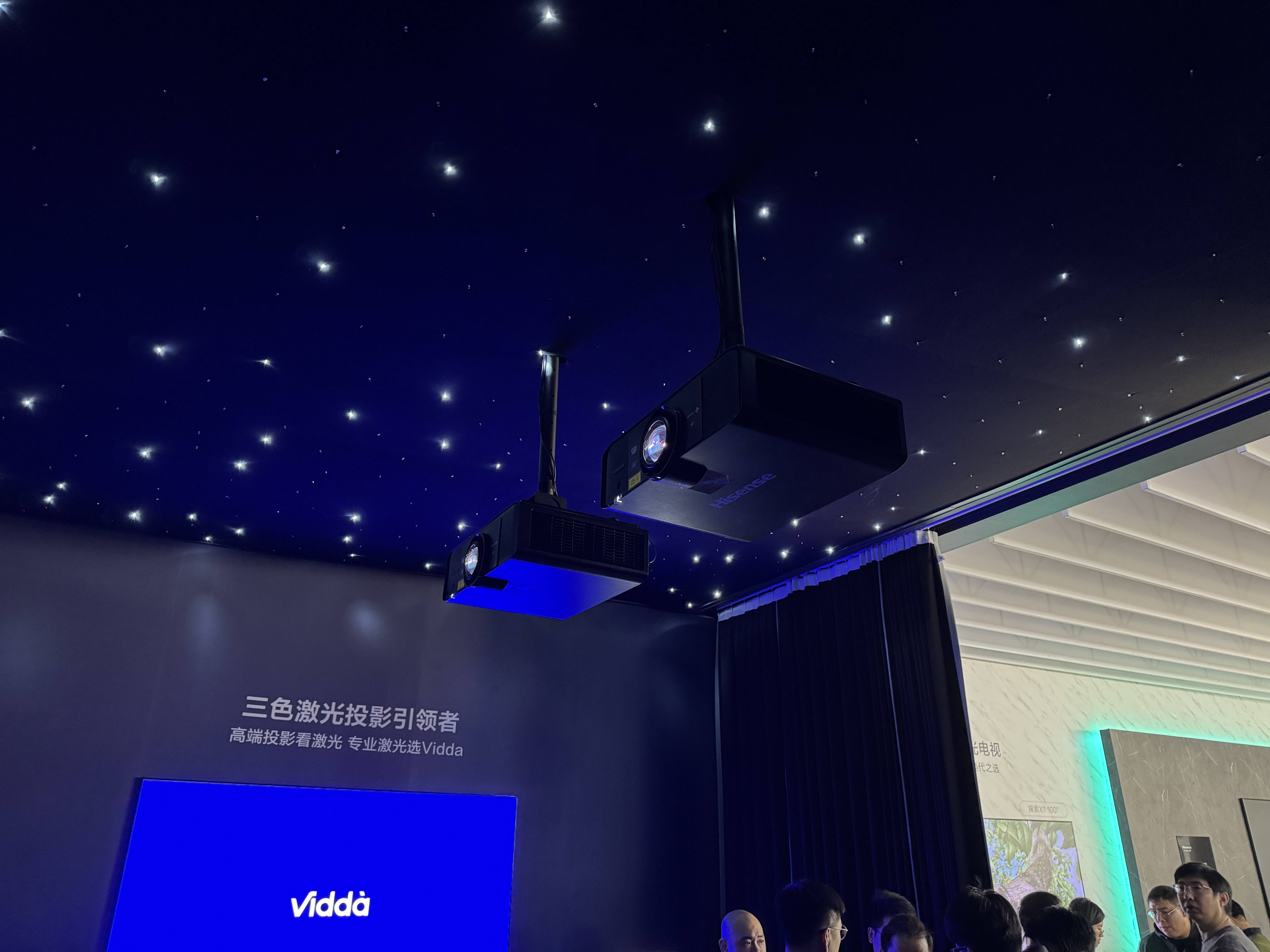 另外海信还展出了一个4K三色激光投影的影院级技术,用了两个三色激光投影仪,每个投影仪最高亮度为7500流明,两个叠加在一起达到15000流明的亮度,实际效果非常惊人,的确有一种观看电影的感觉,无论是亮度、色域、画质,都相当出色。