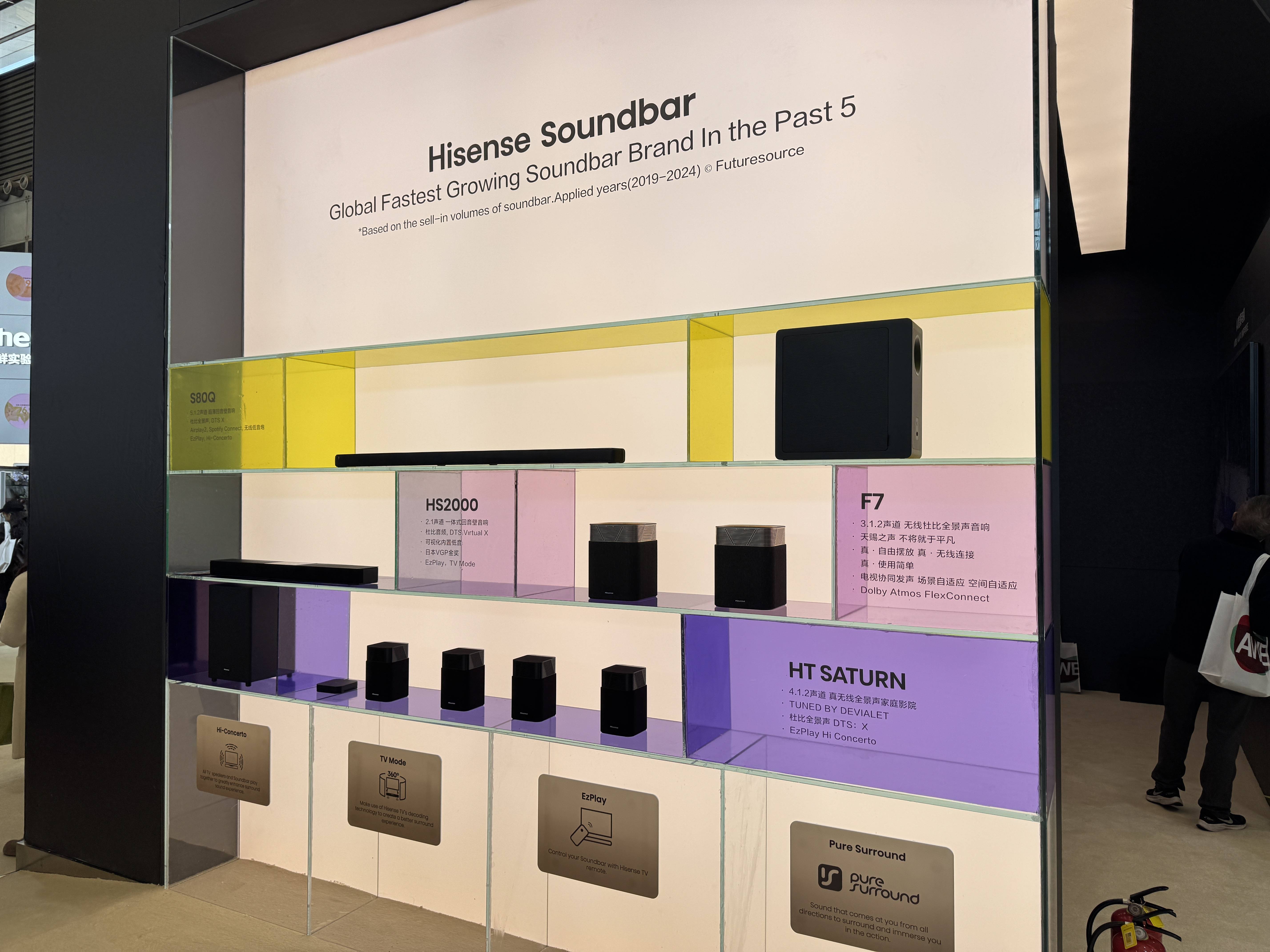 海信展台的产品和演示都很多,但最后我们想聊的是音频产品。海信在回音壁品类上,是去年全球范围内成长速度最快的品牌,同时海信也是首个在电视上支持杜比FlexConnect技术的厂商,去年我们也测试过海信F7这个无线杜比全景声音箱。在AWE上,我们再次看到了海信回音壁的产品。除了传统回音壁形态的S80Q以及无线音箱F7之外,海信的HT Saturn再次出现在我们面前,这个分体式音箱套装的设计,我们曾经试听过,也一直和海信保持着交流,而现在出现在AWE上,这实际上说明它离上市已经不远了。目前我们所知的是,HT Saturn已经完成了和帝瓦雷的合作,而且除了要在国外上市之外,国内也有希望在Q3上市,大家真的可以期待一下。这款产品我们会在不久后拿到,届时我们也将做详细的测试,敬请期待。