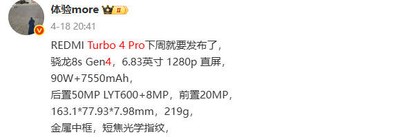 — REDMI Turbo 4 Pro外观曝光,4月24日正式发布! —