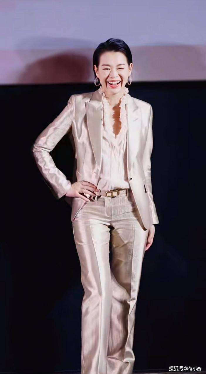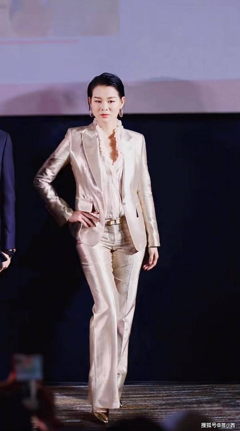 — 胡杏儿穿香槟金色西服套装亮相活动,干练有气场,美出了新高度 —