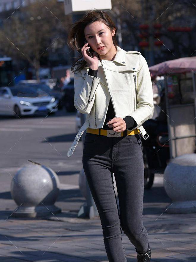 — 白色短款皮衣,搭配高腰牛仔裤,干净利落,显高又显瘦 —