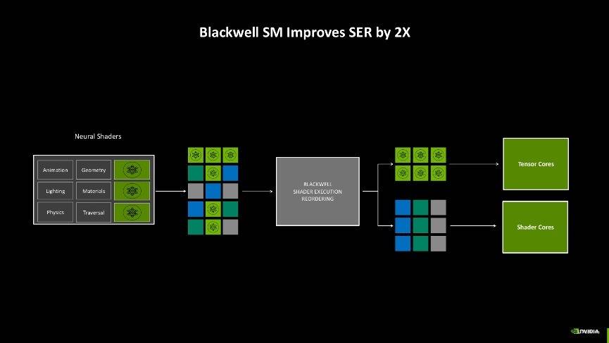 另外一个改进是,过往的着色工作往往只有SM单元的Shader在处理,而Blackwell架构上引入了神经网络渲染以后,使得Blackwell架构上的第五代Tensor核心也能共同分担着色工作,大大提高了着色效率。