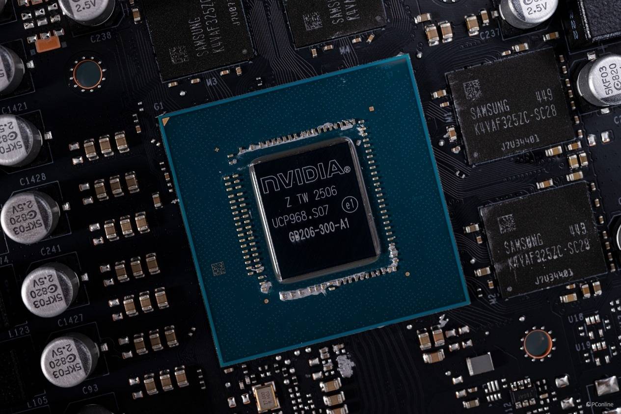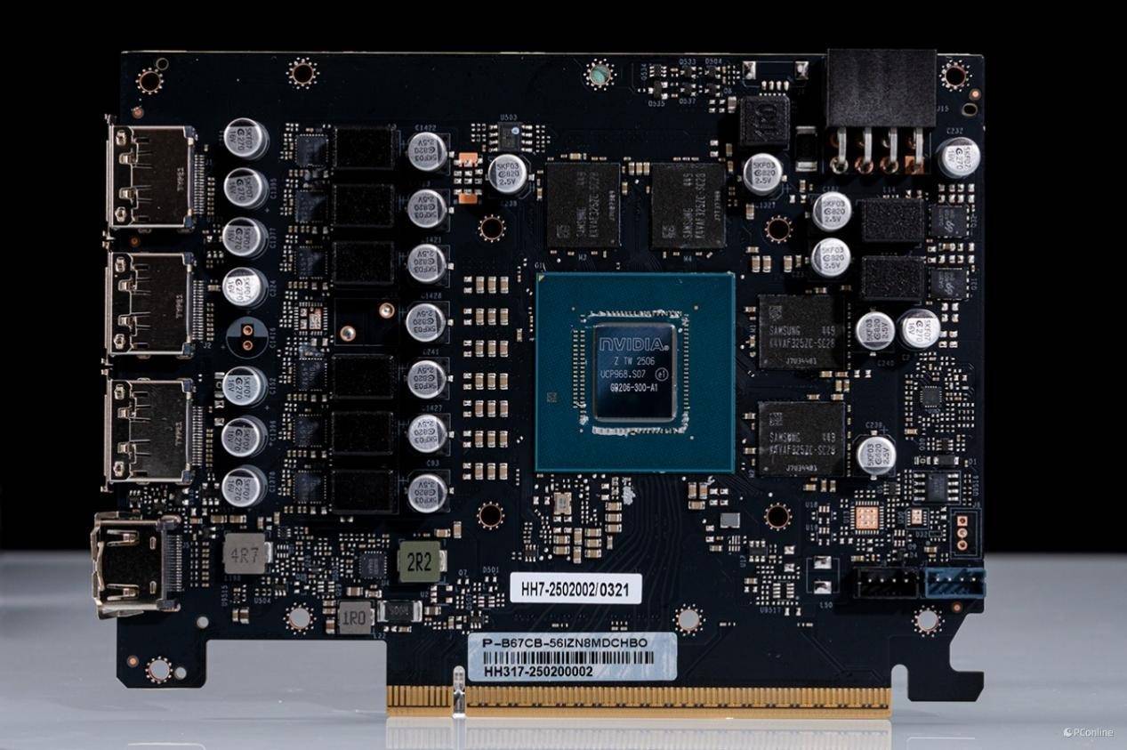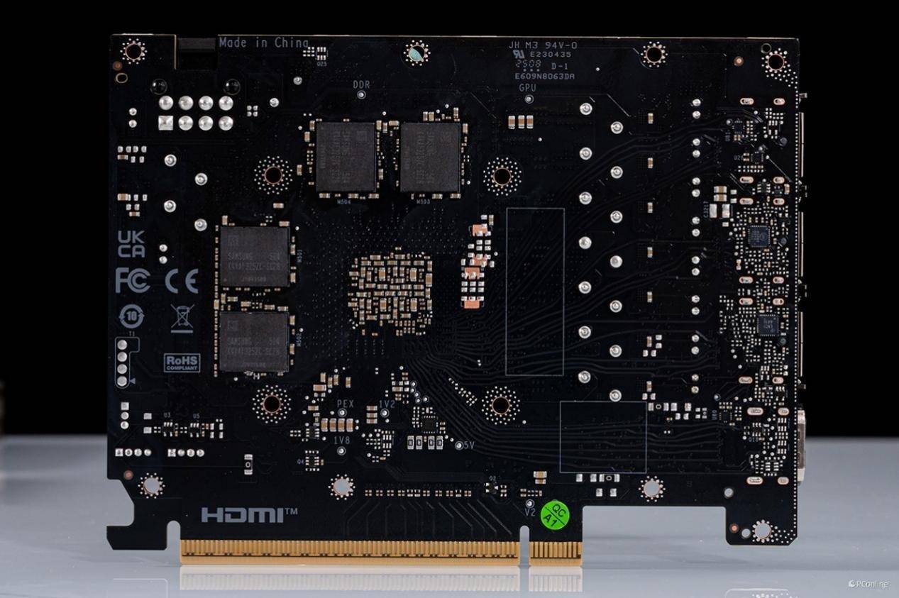 核心的四周则被4颗显存芯片包围,规格上是GDDR7,由三星提供,单颗2GB,正面共8GB。