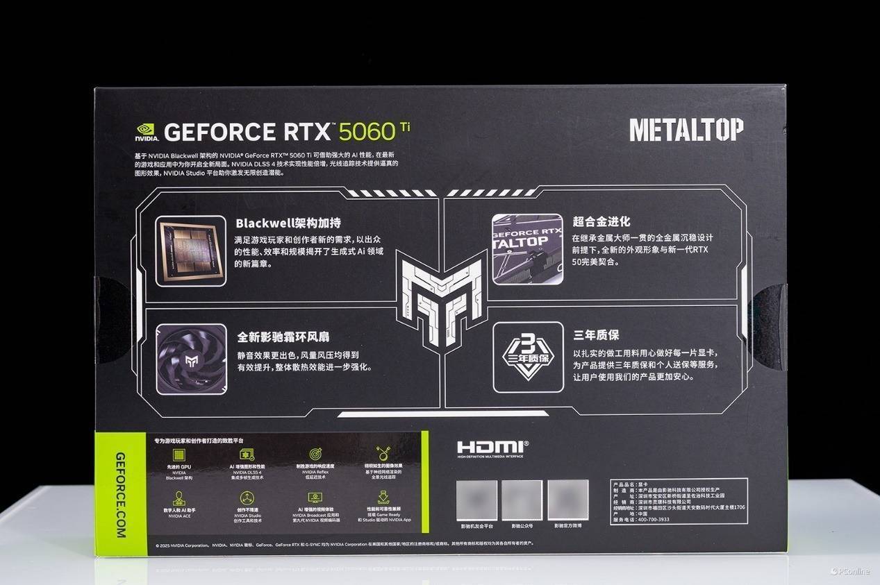 在外包装设计上,影驰GeForce RTX 5060 Ti 金属大师黑金版 MAX OC 16GB显卡还是熟悉的味道,采用经典的黑灰配色设计,正中央是巨型的金属大师LOGO,异常抢眼。底部则是NVIDIA标志性的绿色,左下角还有三年质保与个人送保字样,让玩家买的放心用的放心。