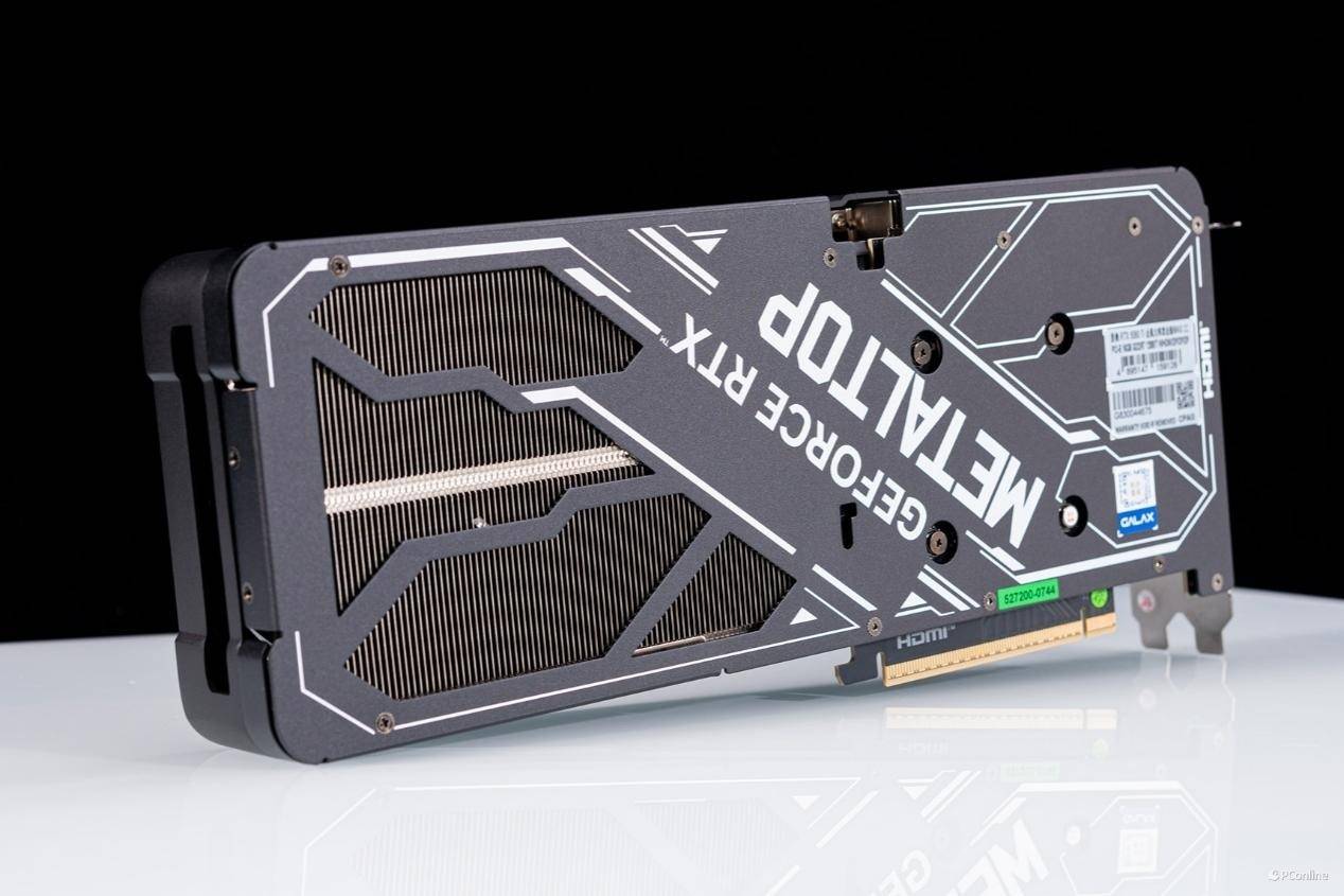 翻转视角看看显卡的背部,其背板采用全金属打造,同时延续了正面机甲的设计风格。大面积的线条切割纹理加上“METALTOP”的标识,让显卡颜值更进一步。