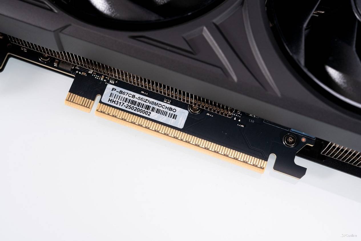 当然,参与供电的不止8Pin接口,显卡底部的PCIe金手指也会参与部分供电。并且这一代显卡的PCIe接口升级成为了5.0速率,这也是首次在RTX 50系显卡上应用,能够带来更高的传输速率,另外仔细看金手指的形状,它和上一代的显卡也有些微的变化。