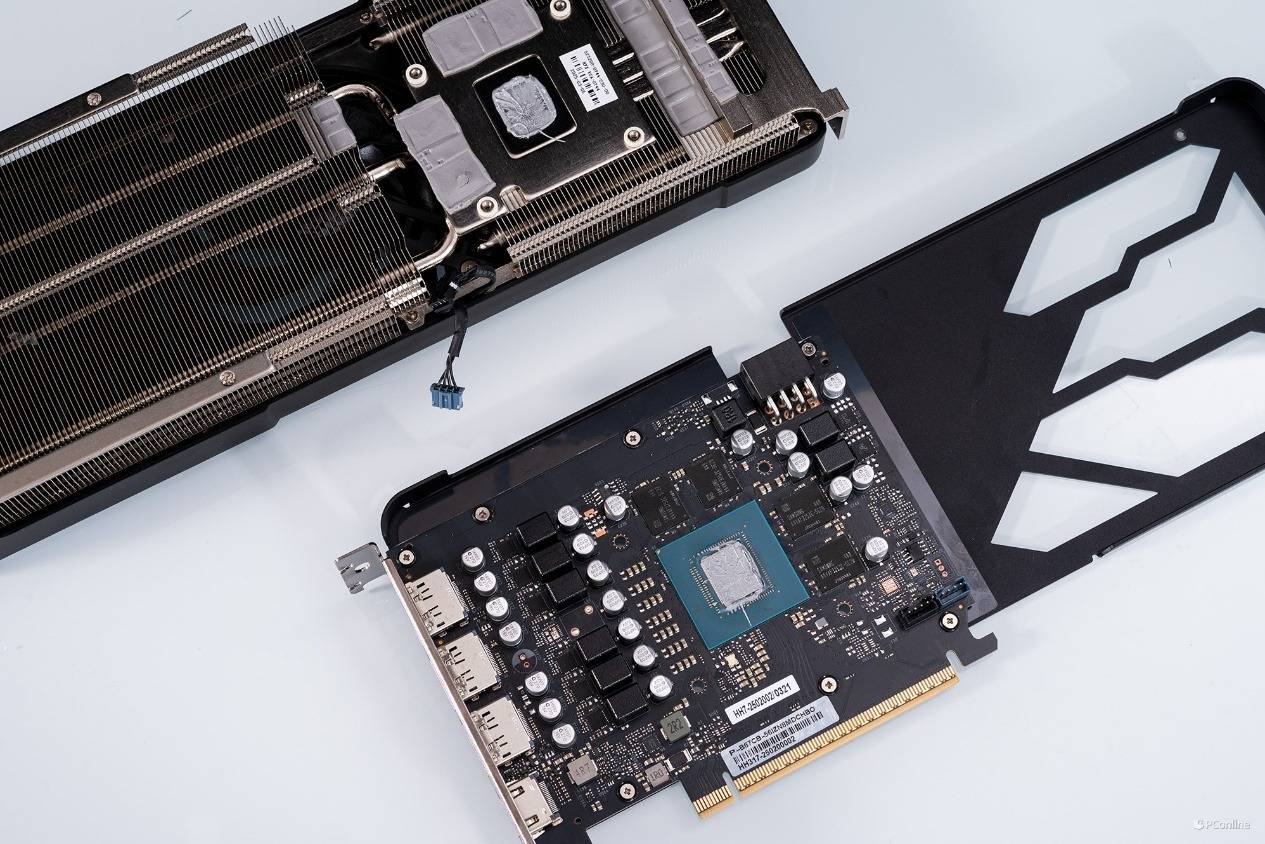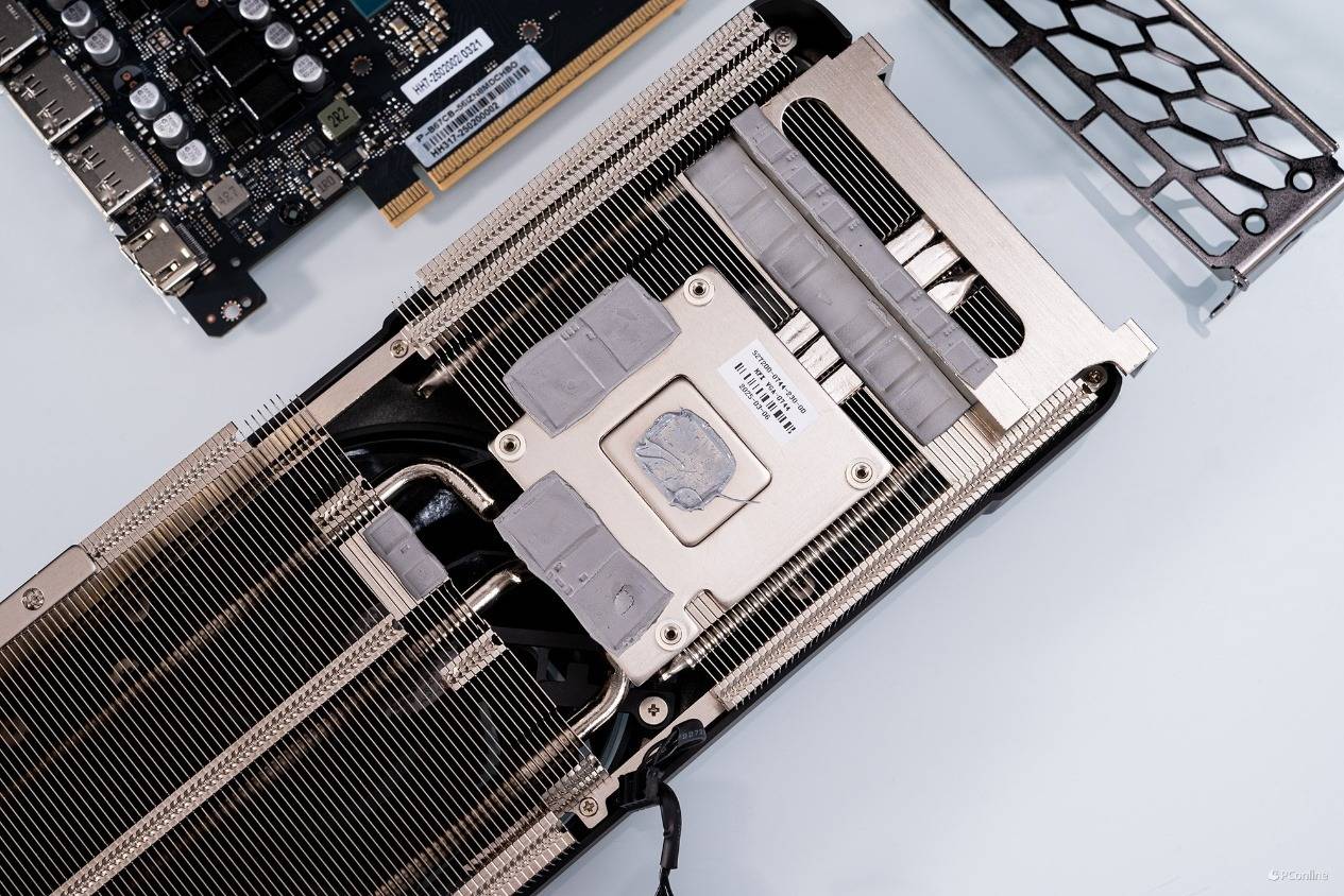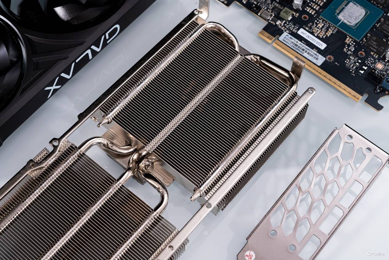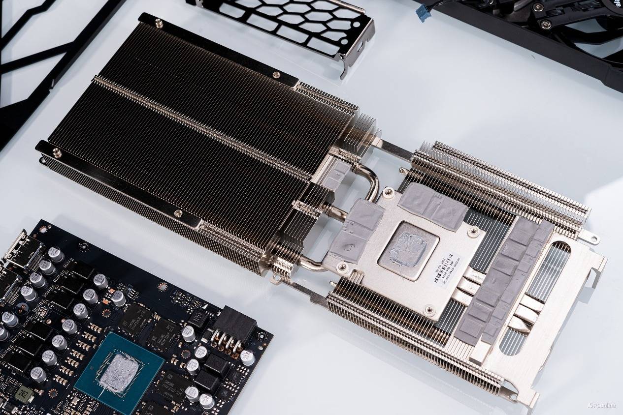 整个显卡散热模组还是非常硕大的,可以分为左右两个部分,左侧是密密麻麻的散热鳍片,配合气流,能够快速带离热量,提升整体冷却效能。