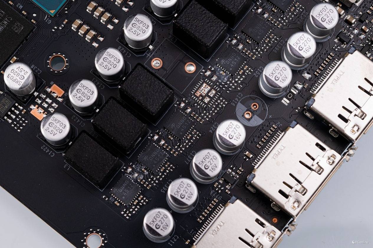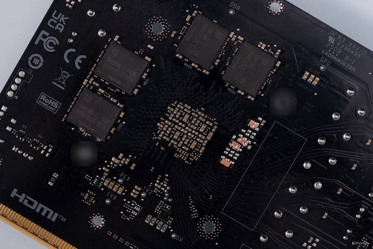 PCB的背部还有4颗GDDR7显存芯片,同样是单颗2GB,正反两面共组成了这款显卡的16GB超大显存配置。