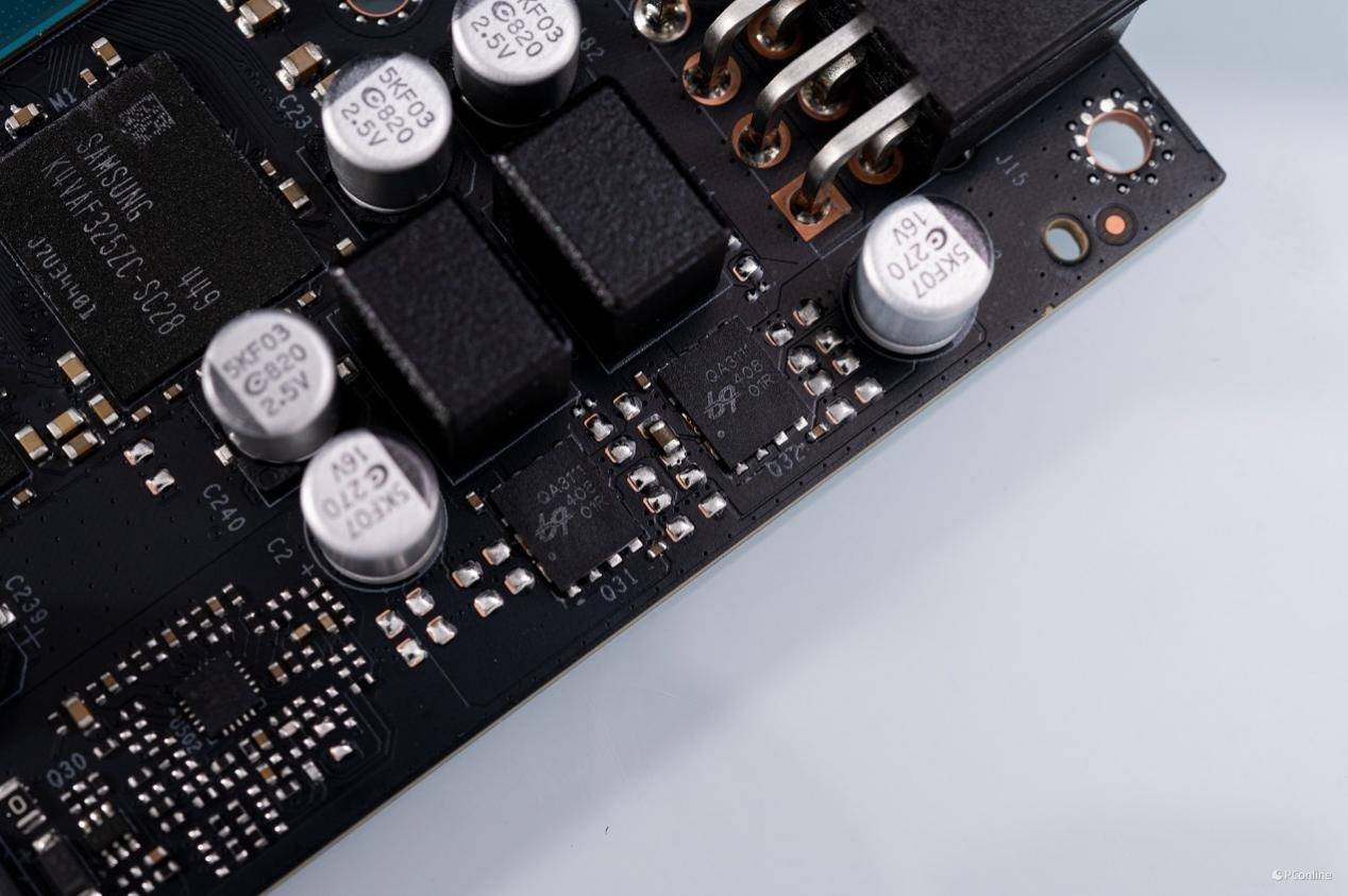 供电接口则是我们熟悉的8Pin接口,并且旁边还有一颗1R0贴片电阻,其主要作用是储存电能并滤除电源中的杂波和干扰,确保向核心等关键部件提供纯净、稳定的电流。
