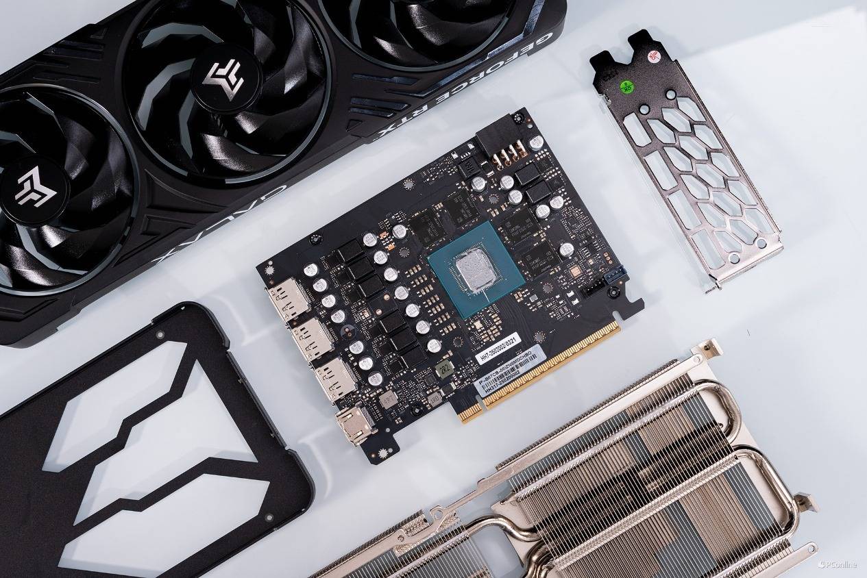 看完了外观我们接下来看看这张显卡的内在。拆解影驰GeForce RTX 5060 Ti 金属大师黑金版 MAX OC 16GB还是比较简单的,仅需拧下背板与侧边IO面板的螺丝即可分离PCB与散热器。
