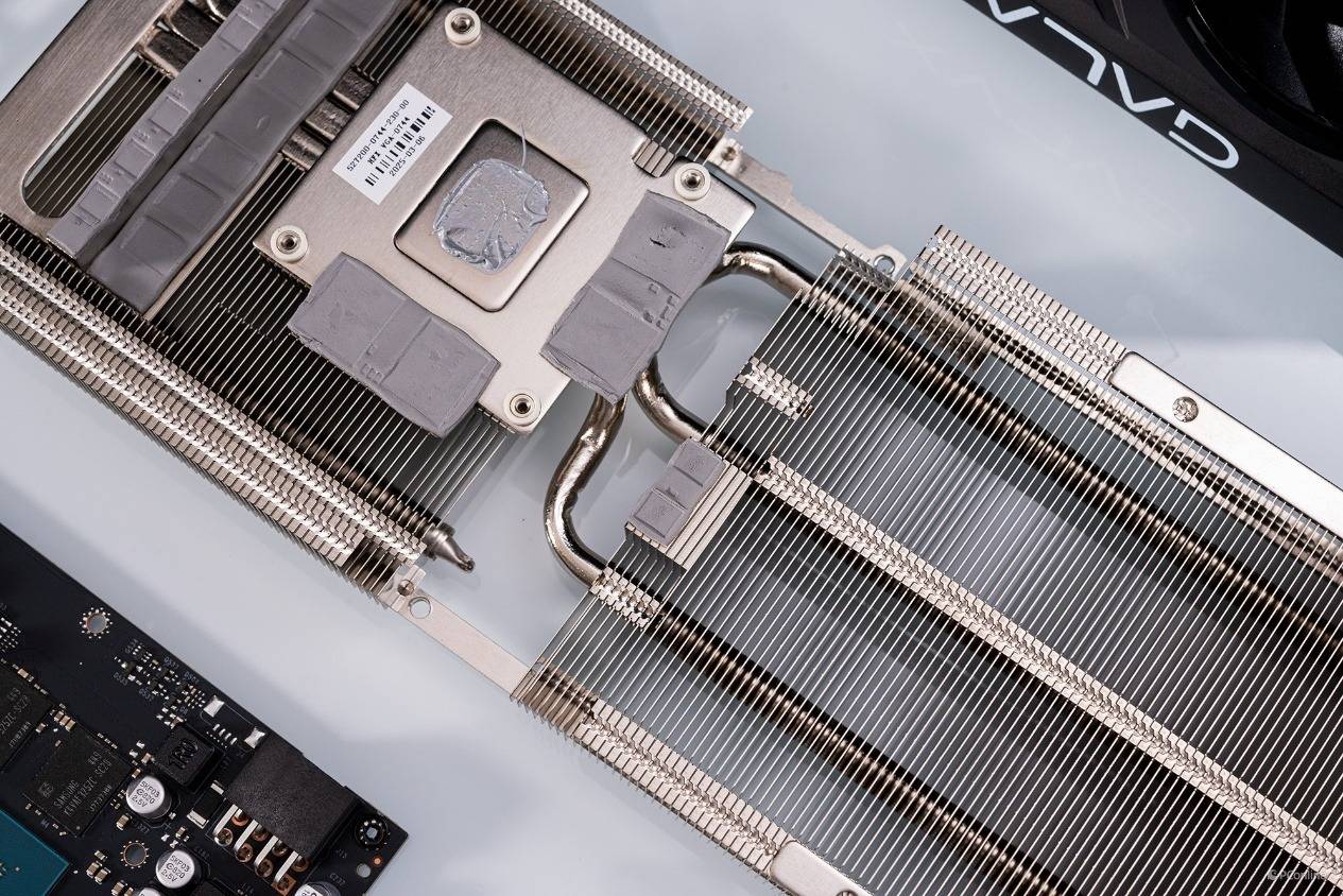 率先映入眼帘的就是正中间这个大面积且非常厚实的镀镍铜底座。四周是影驰为显存、电感等部件准备的高导热系数的导热垫。