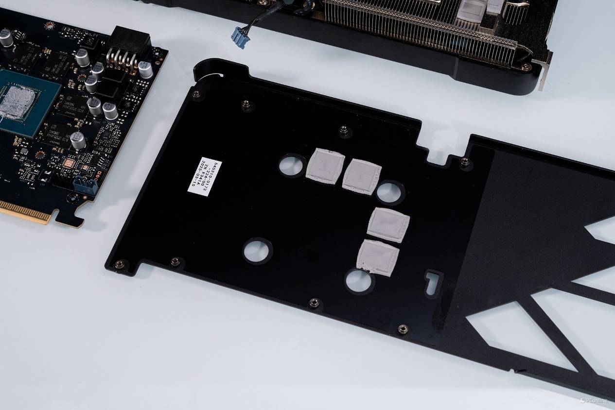 另外,影驰还给这款显卡的背板也进行了散热改进,首先是金属材质能够提升一定的导热能力,其次是在显存以及核心的背面都贴上了高导热系数的导热垫,能够将这些发热部件的热量快速导到背板上,从而快速散出显卡内部。