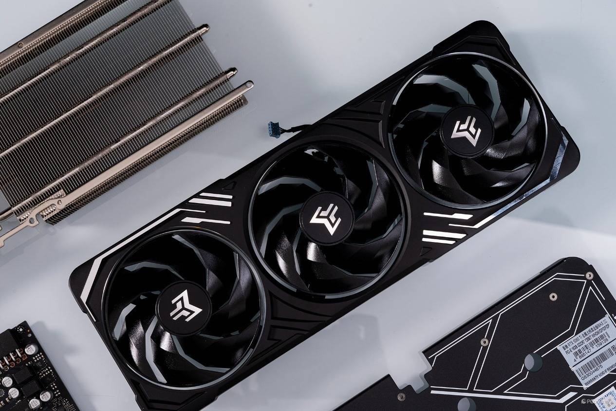 散热风扇部分,影驰也进行了升级。影驰GeForce RTX 5060 Ti 金属大师黑金版 MAX OC 16GB标配三把全新的霜环散热风扇,每把风扇直径90mm,单从规格上就不难看出它的实力强劲。