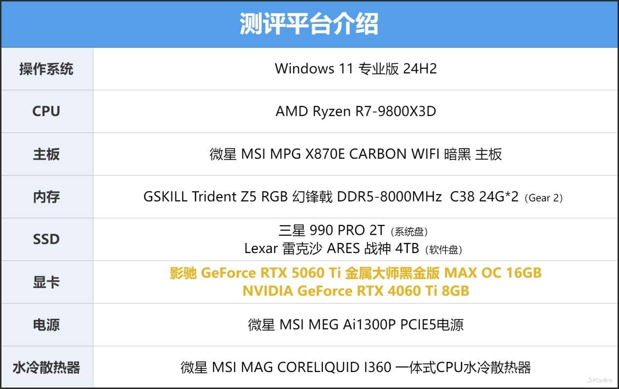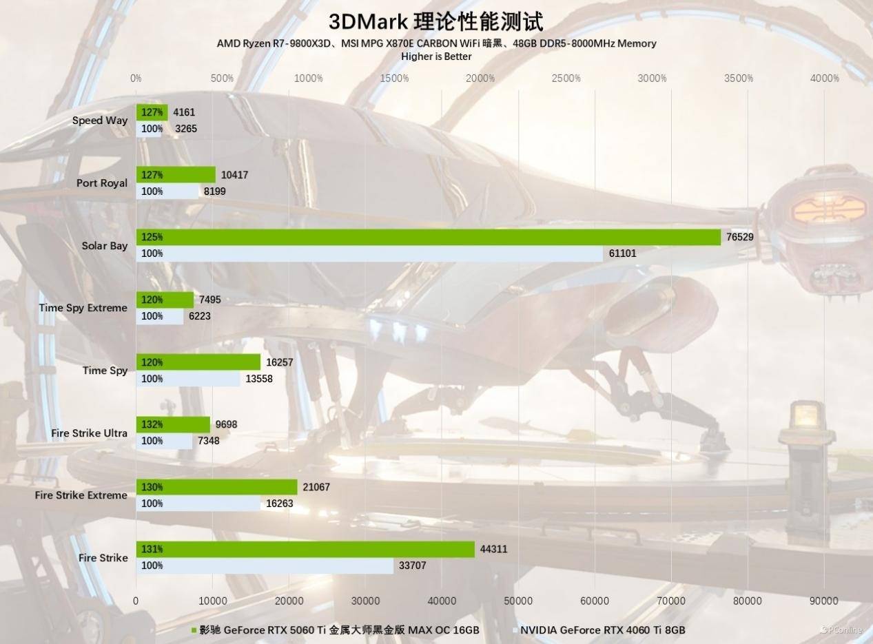 在DX12的Time Spy测试中,影驰GeForce RTX 5060 Ti 金属大师黑金版 MAX OC 16GB同样表现出色,其性能领先RTX 4060 Ti约20%,进一步证明了其在新一代架构下的显著提升。