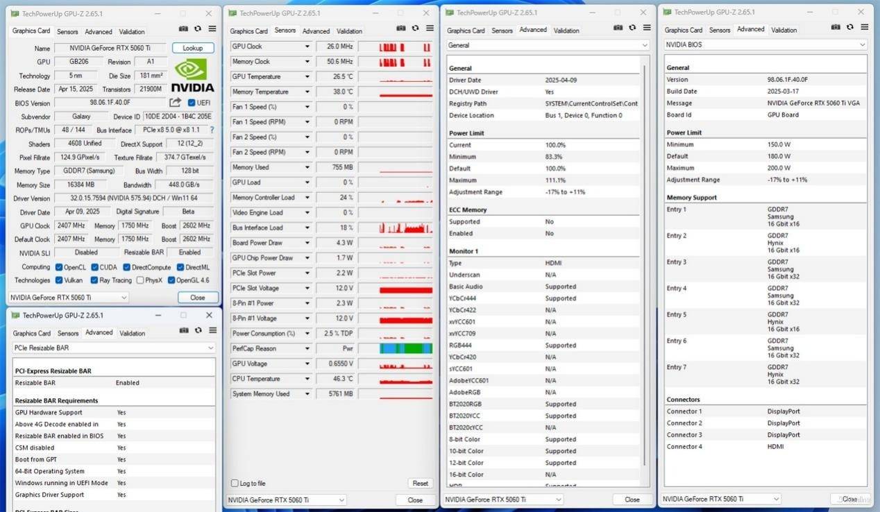 开始测试前,照例还是要“认识”一下这张显卡。从GPU-Z的信息中可以看到影驰GeForce RTX 5060 Ti 金属大师黑金版 MAX OC 16GB的基准频率为2407MHz,Boost频率为2602MHz,这个频率对比前代RTX 4060 Ti的话,可以说提升了不少,同时也要高于MSRP版本的RTX 5060 Ti。作为OC版本的显卡,它的TDP也比稍高一些,默认为180W,最高可达200W,也算是预留了一定的超频空间。