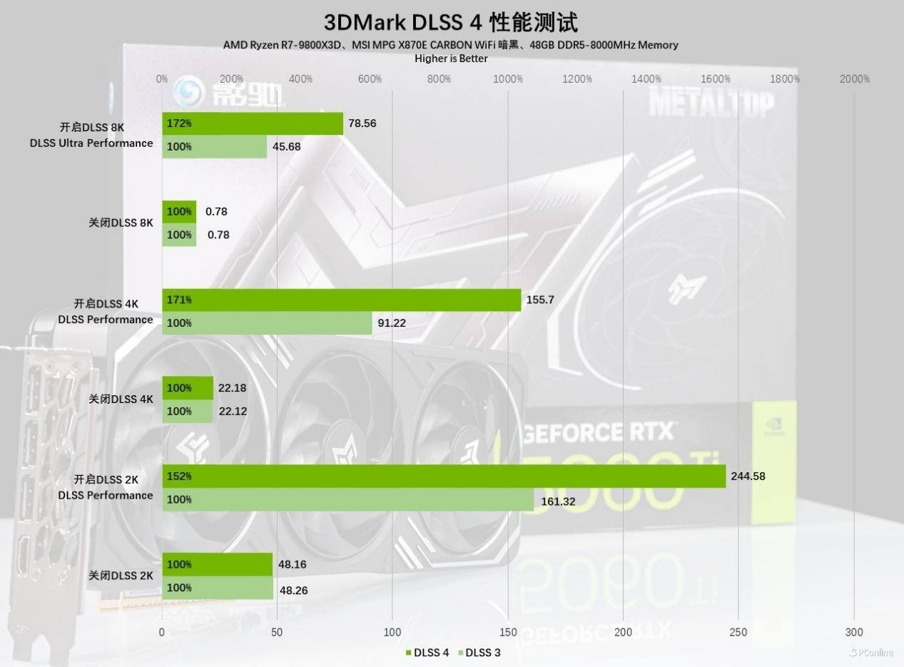 简单介绍完,我们再看看DLSS 4的理论表现如何,还是经典的3DMark测试。不得不说影驰GeForce RTX 5060 Ti金属大师黑金版MAX OC 16GB搭配上DLSS 4后,帧数就跟打了鸡血一样,开关前后的性能简直天壤之别!其中2K分辨率下,开关前后性能差距足足有4倍之多。4K分辨率时帧数差距直接就是7倍。最离谱的还要属8K, 影驰GeForce RTX 5060 Ti金属大师黑金版MAX OC 16GB在DLSS 4加持下可以做到79 FPS,要知道在DLSS 3下,这款显卡几乎不可能实现8K,或许以后甜品卡也能畅享8K游戏也说不定。