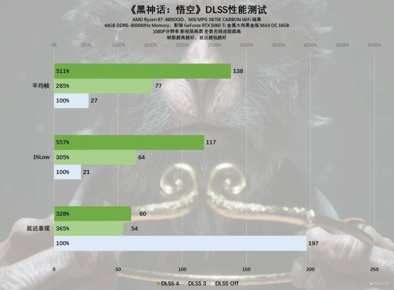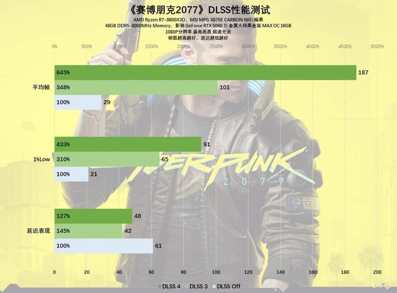 在实际游戏测试中,影驰GeForce RTX 5060 Ti 金属大师黑金版 MAX OC 16GB在原生分辨率下只能跑29 FPS,几乎无法畅玩游戏。开启DLSS 3以后,游戏帧数为101 FPS,体感已经非常流畅了。开启DLSS 4以后,影驰GeForce RTX 5060 Ti 金属大师黑金版 MAX OC 16GB能够做到187 FPS,对比原生分辨率,性能足足提升了6.4倍。1 1% Low帧数也几乎追上了DLSS 3下的平均帧数,整体游戏体验更加出色。
