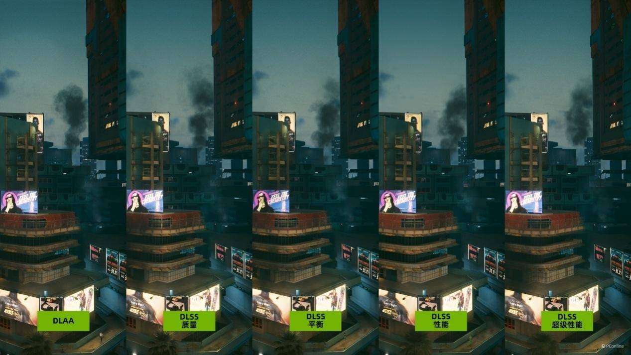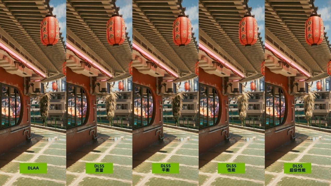 第二与第三个场景还是能够看出部分细节的,例如第二幅图中的霓虹灯牌,DLSS开至性能档以后,能够看到灯牌与前面三张图有些许差异,不过你得靠细致的对比才能看出。实际游戏过程中很难发现,基本不影响观感。