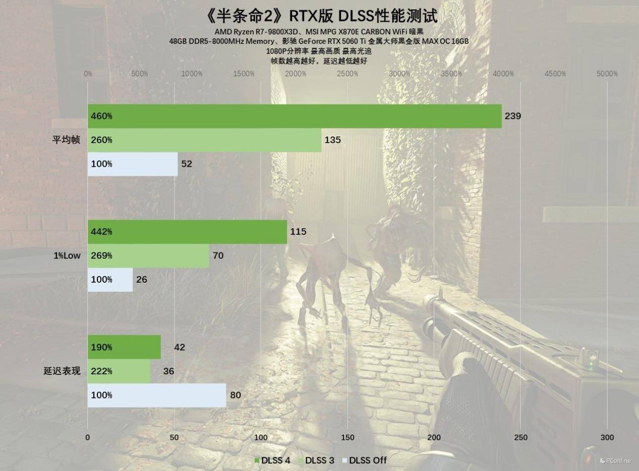 实测下来,只能说《半条命2》RTX版对硬件的开销极大,在原生1080P分辨率下,所有画质、光追均开至最高,不开启超分选项时,影驰GeForce RTX 5060 Ti 金属大师黑金版 MAX OC 16GB帧数为52 FPS,属于能玩但不够好玩的程度。在开启DLSS 3质量档以后,游戏帧数瞬间来到了135 FPS,体验都变得丝滑了许多,而继续开启DLSS 4质量档,游戏帧数又直接来到了239 FPS,对比原生1080P的表现,性能提升高达4.6倍!