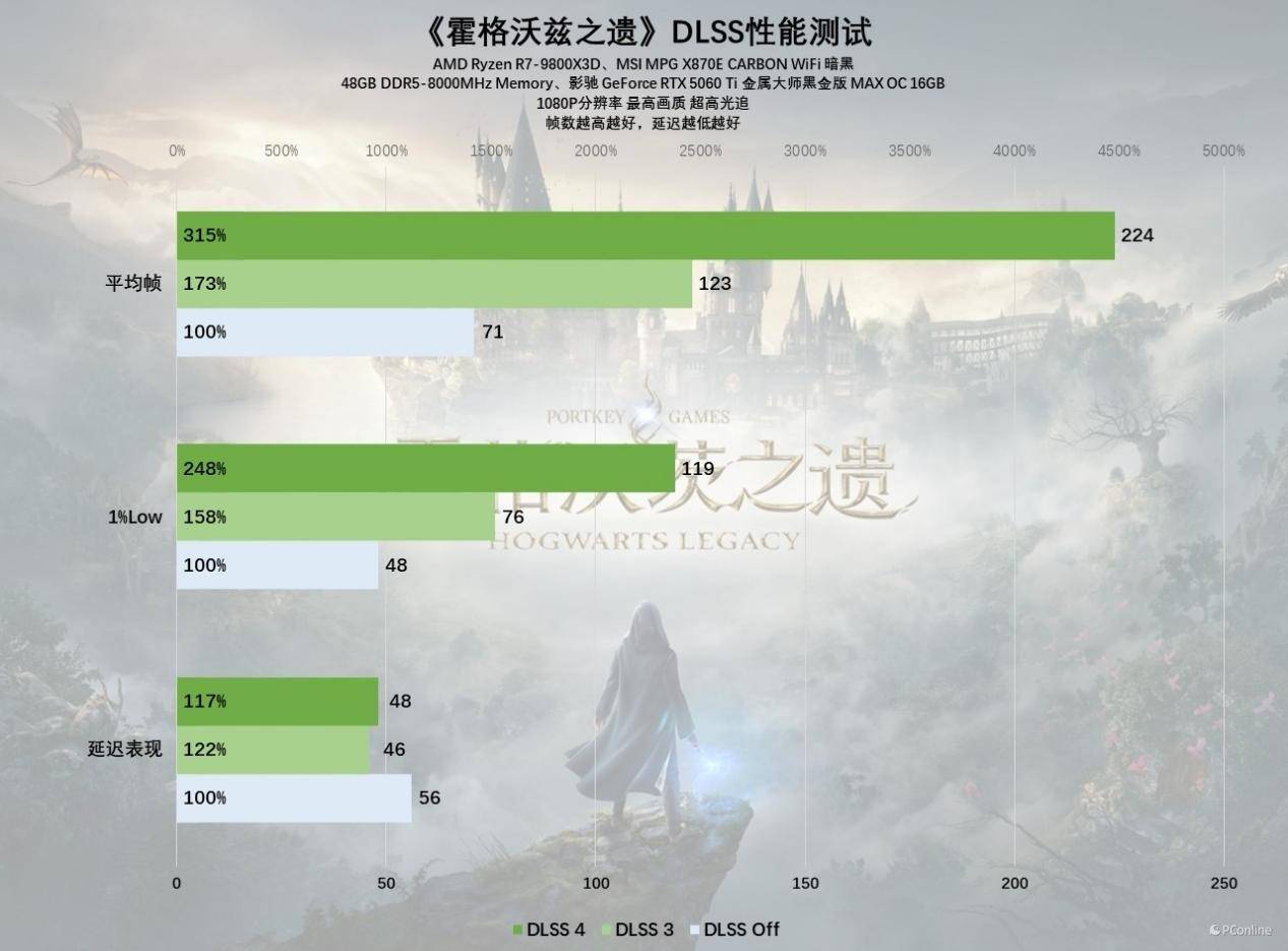 实际测试过程中,《霍格沃兹之遗》这款游戏优化还是不错的,1080P分辨率画质光追均设置最高的情况下,影驰GeForce RTX 5060 Ti 金属大师黑金版 MAX OC 16GB在不开任何超分的情况下,平均帧为71 FPS。如果开启DLSS 3质量档,此时帧数已经能够做到123 FPS了,属于是高刷与画质的完美组合。开启DLSS 4以后,帧数可以进一步提升至224 FPS,对比原生1080P的表现,性能提升了约3倍以上。