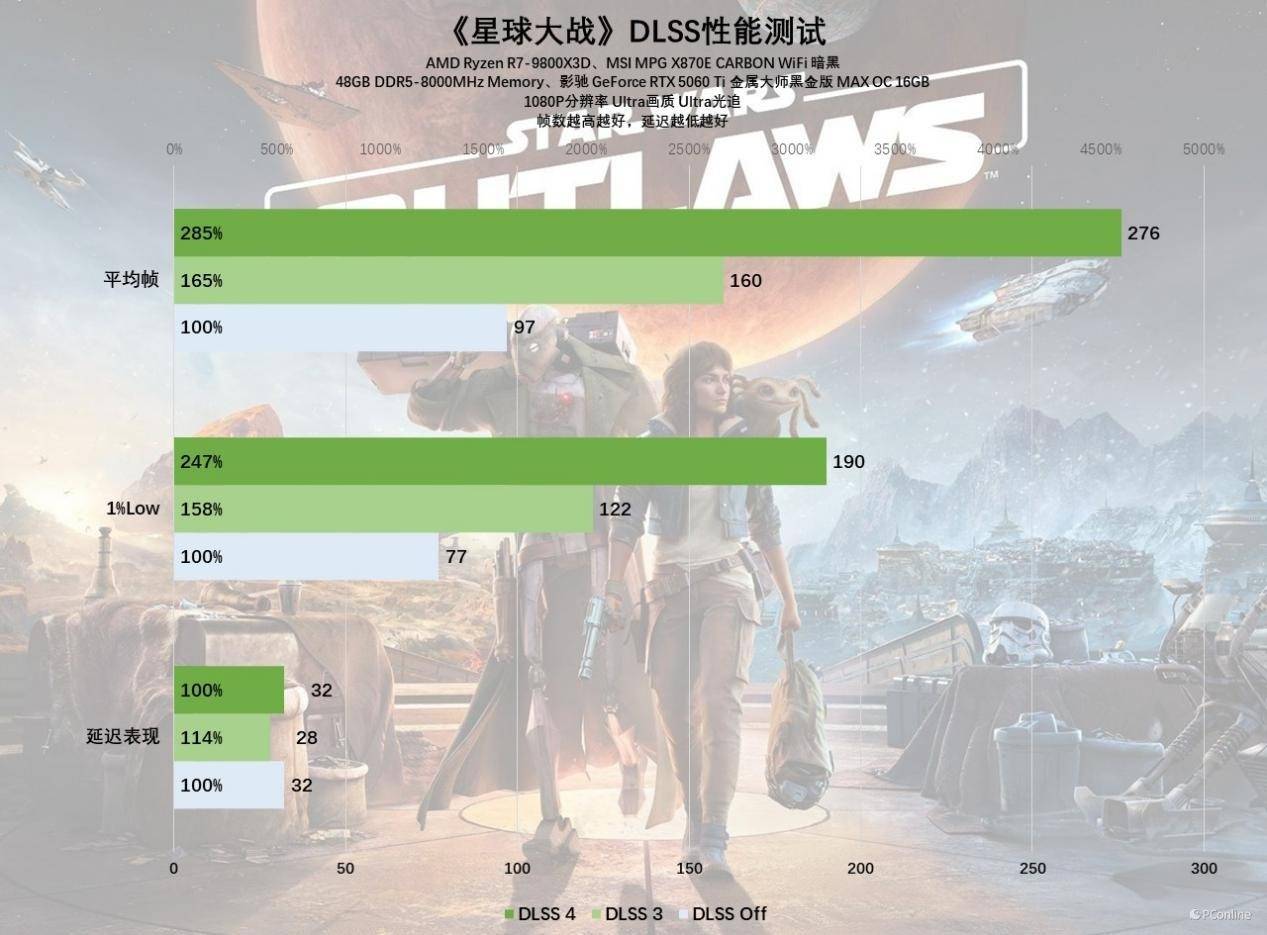 实测DLSS 4在这类优化欠佳的游戏中确实大有用处,在1080P原生分辨率下,影驰GeForce RTX 5060 Ti 金属大师黑金版 MAX OC 16GB的平均帧仅有97 FPS,整体游玩体验还不错。而开启DLSS 4质量档以后,游戏平均帧直接暴增至276 FPS,游戏体验就像变天一样,丝滑得不像在玩3A,更像在玩网游一样,对比原生1080P的表现,足足有2.8倍左右的提升。即便是对比DLSS 3的160 FPS,那也提升巨大。