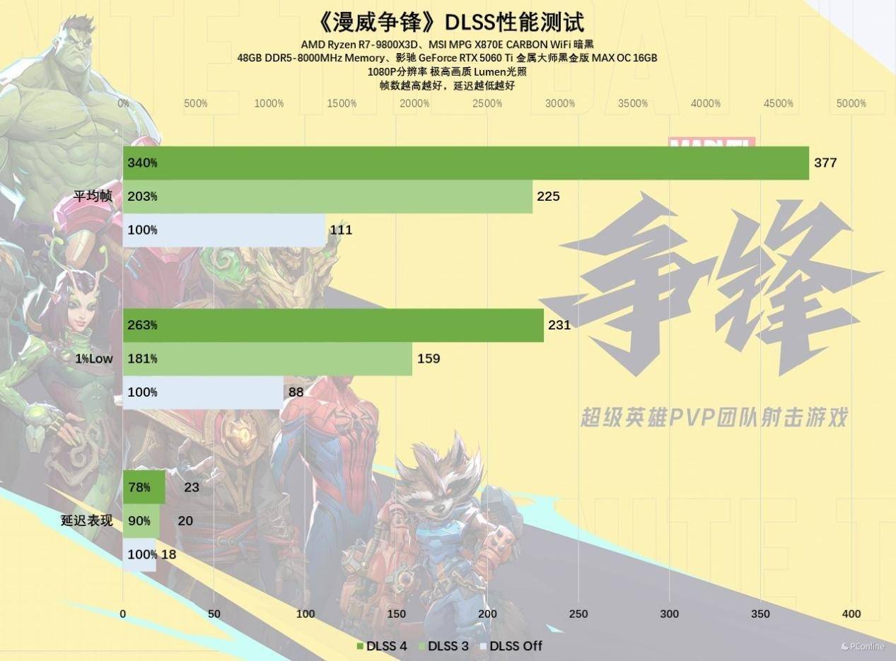 最后一款游戏是我们的老熟人《漫威争锋》,这款游戏在RTX 50系显卡首发之时,它还没有完全适配DLSS 4,玩家想要体验多帧生成功能还需要依靠NVIDIA App的DLSS 4优设功能。不过现在《漫威争锋》也正式支持DLSS 4了,与上面的游戏一样,玩家在游戏设置中就能直接开启,并且提供了2x、3x以及4x选项,玩家可以随意选择是插一帧、插两帧还是插三帧。