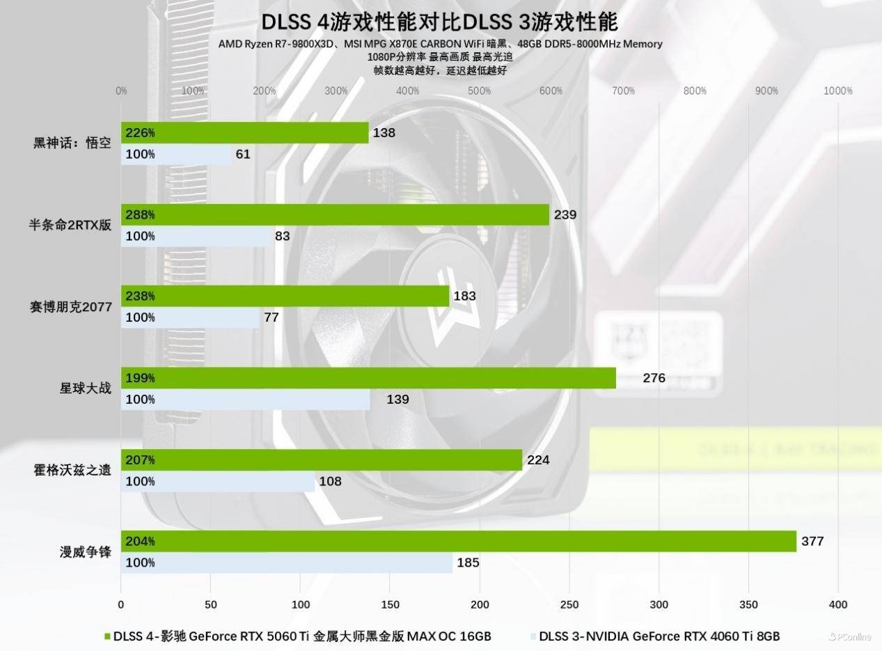 性能方面则是这款显卡带给我们最大的惊喜,影驰GeForce RTX 5060 Ti金属大师黑金版MAX OC 16GB展现了跨代级的性能提升。在1080P分辨率下,相比上代RTX 4060 Ti平均性能提升20%-30%,部分优化良好的游戏甚至可实现240+ FPS甚至接近300 FPS的电竞级体验。而在DLSS 4技术加持下,这款显卡的性能提升更是夸张,对比原生分辨率,最高可以提升6倍以上,彻底颠覆了甜品级显卡的性能上限。