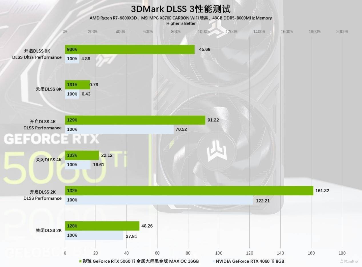 在3DMark的DLSS 3性能测试中,影驰GeForce RTX 5060 Ti 金属大师黑金版 MAX OC 16GB在2K分辨率下,相较于RTX 4060 Ti,性能提升幅度大约为32%。而在4K分辨率下,开启DLSS 3后,性能领先幅度也基本保持在29%左右。考虑到两款显卡的CUDA核心差距仅约5%,不得不说,NVIDIA的Blackwell架构确实为性能带来了显著的提升。