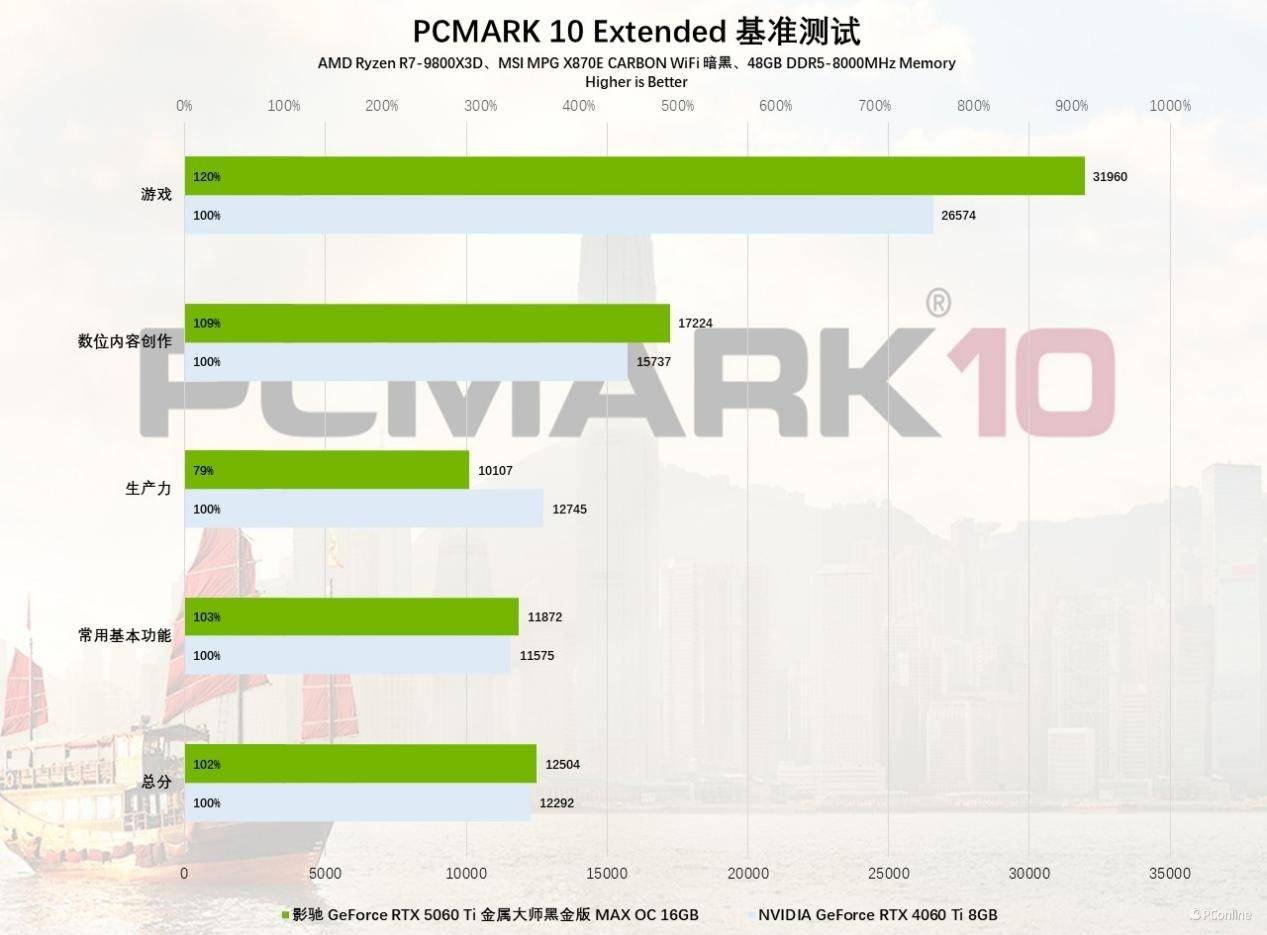 看过了游戏,下面就是专业创作领域的内容了。在专业创作领域,影驰GeForce RTX 5060 Ti 金属大师黑金版 MAX OC 16GB同样展现出了不俗的实力。在PCMark10 Extended综合场景测试中,这款显卡在游戏和数字内容创作方面的得分较RTX 4060 Ti高出9%-20%,然而在生产力子项中,新显卡的表现略低于预期,推测与当前驱动程序优化程度有关。