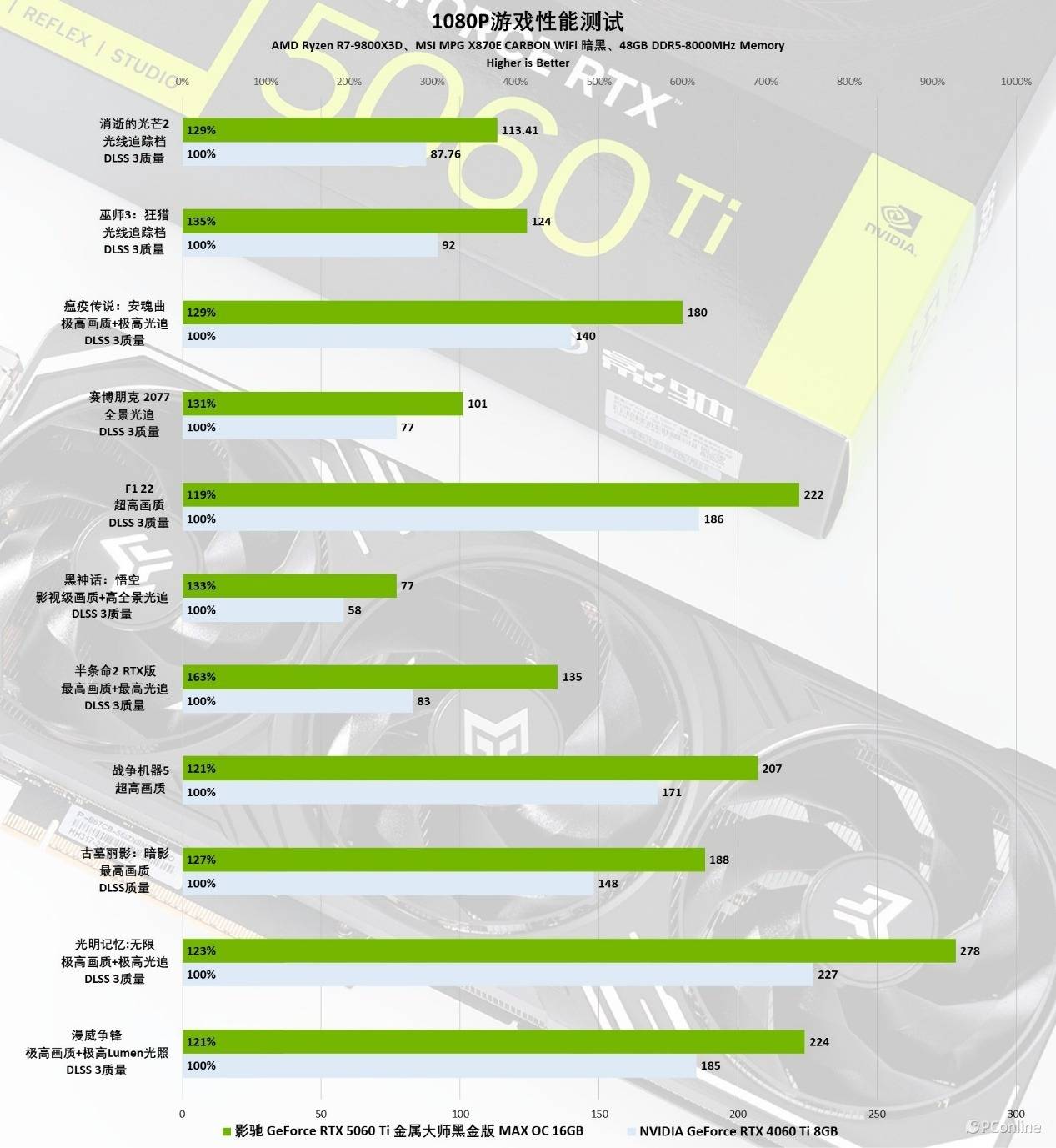 实测1080P分辨率下,影驰GeForce RTX 5060 Ti 金属大师黑金版 MAX OC 16GB还是非常让人惊喜的,其能够轻松应对绝大多数游戏,甚至在一些优化良好的游戏中,如《F1 22》和《光明记忆:无限》,能够达到200+ FPS,接近300 FPS。而在硬件压力较大的游戏如《黑神话:悟空》中,这款显卡也能达到77 FPS,在《赛博朋克2077》中更是超过了100 FPS。总体而言,影驰GeForce RTX 5060 Ti 金属大师黑金版 MAX OC 16GB在3A游戏中表现出色,性能整体比RTX 4060 Ti强约20-30%。