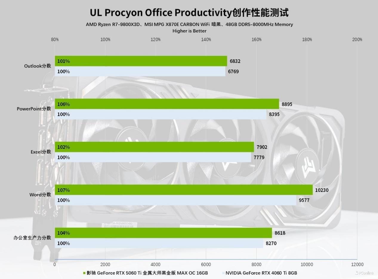 针对办公软件的专项测试显示,影驰GeForce RTX 5060 Ti 金属大师黑金版 MAX OC 16GB与RTX 4060 Ti在日常办公场景下表现相当,整体性能稍微领先4%左右。两者均能轻松应对文档处理、电子表格和演示文稿等任务。无论是专业创作还是日常办公,影驰GeForce RTX 5060 Ti 金属大师黑金版 MAX OC 16GB都能提供足够的性能保障。