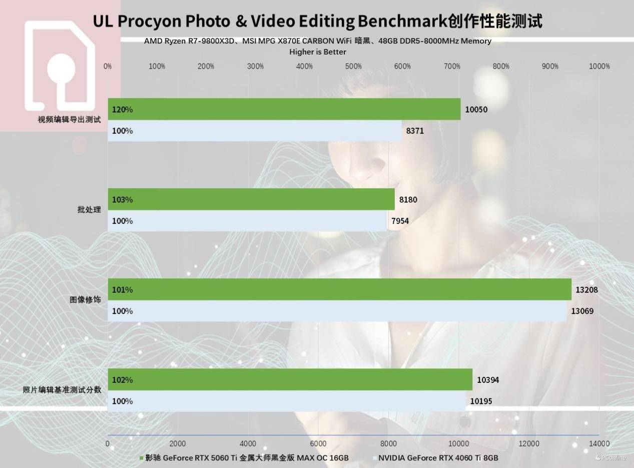 在图像编辑与视频创作领域,通过UL Procyon基准测试发现两款显卡在静态图像处理性能上几乎持平(差距仅2%),但在视频剪辑任务中,影驰GeForce RTX 5060 Ti 金属大师黑金版 MAX OC 16GB凭借新一代NVENC编码器实现了20%的领先优势。