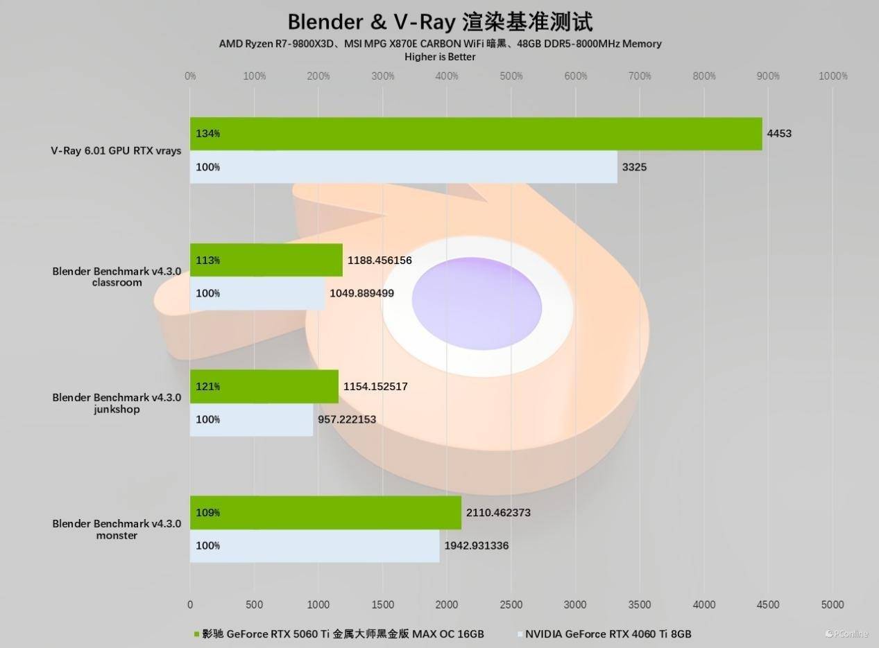 在图像与视频创作领域,影驰GeForce RTX 5060 Ti 金属大师黑金版 MAX OC 16GB展现了令人瞩目的性能优势。而在3D渲染创作方面,这款显卡同样不负众望,尤其在Blender和V-Ray两款专业渲染软件中,其表现令人惊艳。在Blender的渲染测试中,这款显卡的性能领先RTX 4060 Ti约20%左右,无论是复杂场景的光影处理还是材质细节的呈现,都能显著缩短渲染时间。而在V-Ray的RTX项目测试中,领先幅度更是高达30%以上,充分展现了其在光线追踪上的强大能力。