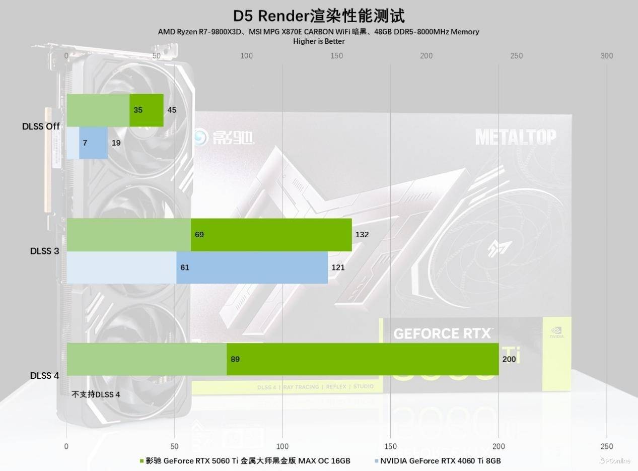 D5 Render作为一款基于DXR光线追踪技术的GPU渲染器,其画面质量备受好评。全新的影驰GeForce RTX 5060 Ti 金属大师黑金版 MAX OC 16GB在这款软件中不仅支持DLSS 3帧生成,还可以通过NVIDIA App实现最新的DLSS 4多帧生成功能。