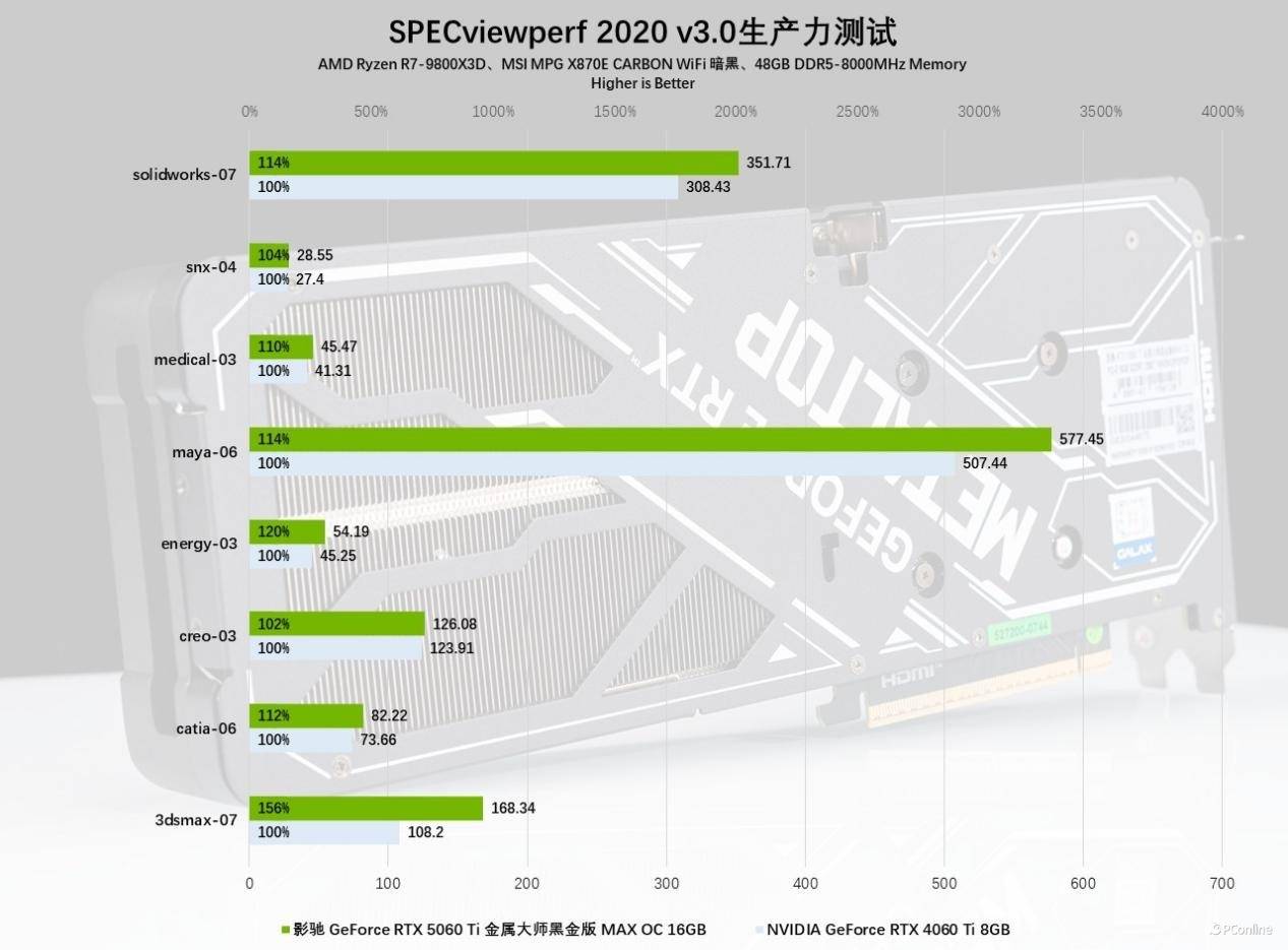 在工业领域的SPEC2020测试中,影驰GeForce RTX 5060 Ti 金属大师黑金版 MAX OC 16GB继续展现出卓越的整体性能。在多项测试中,其性能较RTX 4060 Ti平均提升15%-20%,而在3dsmax-07项目中,性能提升幅度更是高达56%。无论是3D渲染、光线追踪还是工业级创作,影驰GeForce RTX 5060 Ti 金属大师黑金版 MAX OC 16GB都以强劲的性能表现,为创作者提供了高效可靠的创作工具。