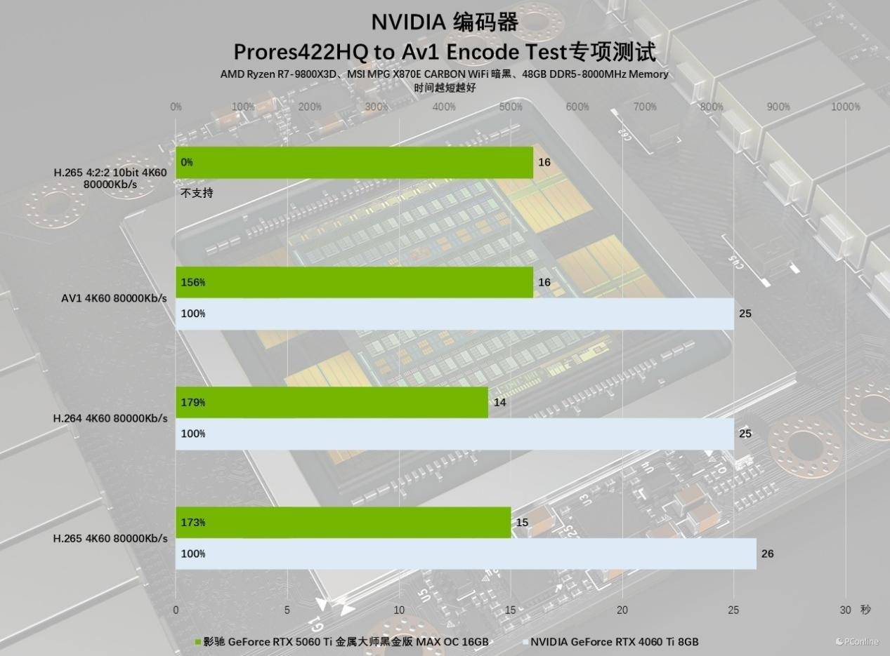 值得一提的是,GeForce RTX 50系显卡还能够支持4:2:2色度取样的视频编解码,这将节省CPU的负担,加快创作速度。上面的图表里也可以看到我们的测试成绩,实测导出时间会比上代显卡快不少,毕竟RTX 40系显卡不支持该功能,仅支持4:2:0色度采样,如果一定要4:2:2导出只能靠CPU软解。
