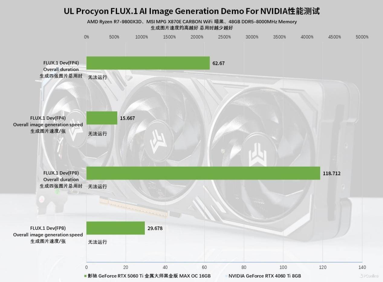 在测试中,我们使用了UL Procyon的FLUX.1 AI Image Generation Demo For NVIDIA进行评估。结果显示,在FP8精度模型测试时,影驰GeForce RTX 5060 Ti 金属大师黑金版 MAX OC 16GB能够以29.678秒的速度生成一张图片,而RTX 4060 Ti由于显存不足,无法完成测试。当切换到FP4精度模型后,影驰显卡的性能进一步提升,生成一张图片仅需15.667秒,效率几乎翻倍,之所以能够实现如此之大的进步,一方面是显卡性能本身的提升,另一方面则是因为FP4精度作为一种低精度量化技术,能够在保持模型性能的同时显著降低显存占用和运算复杂度,从而大幅提升AI任务的效率。