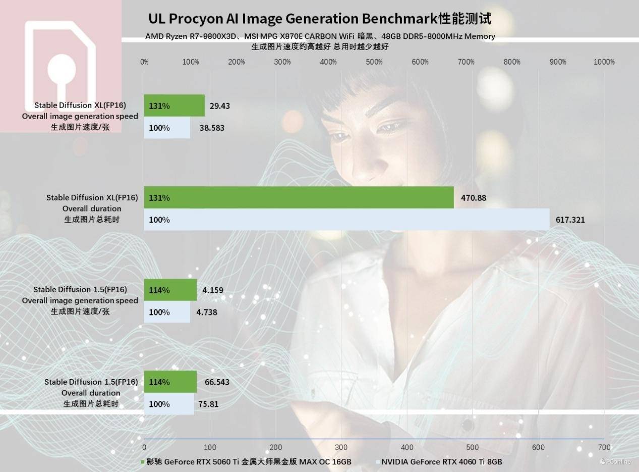 看过了FP4以及FP8,我们再看看影驰GeForce RTX 5060 Ti 金属大师黑金版 MAX OC 16GB在Stable Diffusion中FP16下的表现如何,还是用UL Procyon进行测试,在比较轻松的SD 1.5文生图测试里,影驰GeForce RTX 5060 Ti 金属大师黑金版 MAX OC 16GB生成一张图的速度仅需66.543秒,效率比上代显卡快了14%。而即便是在压力比较大的SDXL中,,生成一张图的速度也仅为29.43秒,同样领先RTX 4060 Ti约31%。