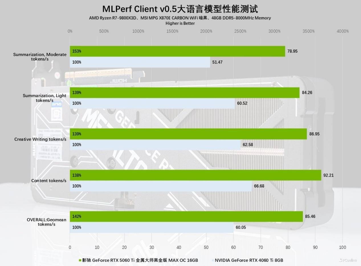 在AI文本生成测试中,影驰GeForce RTX 5060 Ti 金属大师黑金版 MAX OC 16GB显卡也展现出了卓越的性能。通过MLPerf Client v0.5大语言模型进行测试,该模型基于meta的Llama 2 7B开源LLM打造,涵盖了内容生成、创意写作以及对不同长度文本进行总结摘要等四项AI任务。影驰GeForce RTX 5060 Ti 金属大师黑金版 MAX OC 16GB在每一项测试中均表现出了非凡的统治力,性能提升幅度最高可达53%,遥遥领先于前代RTX 4060 Ti。