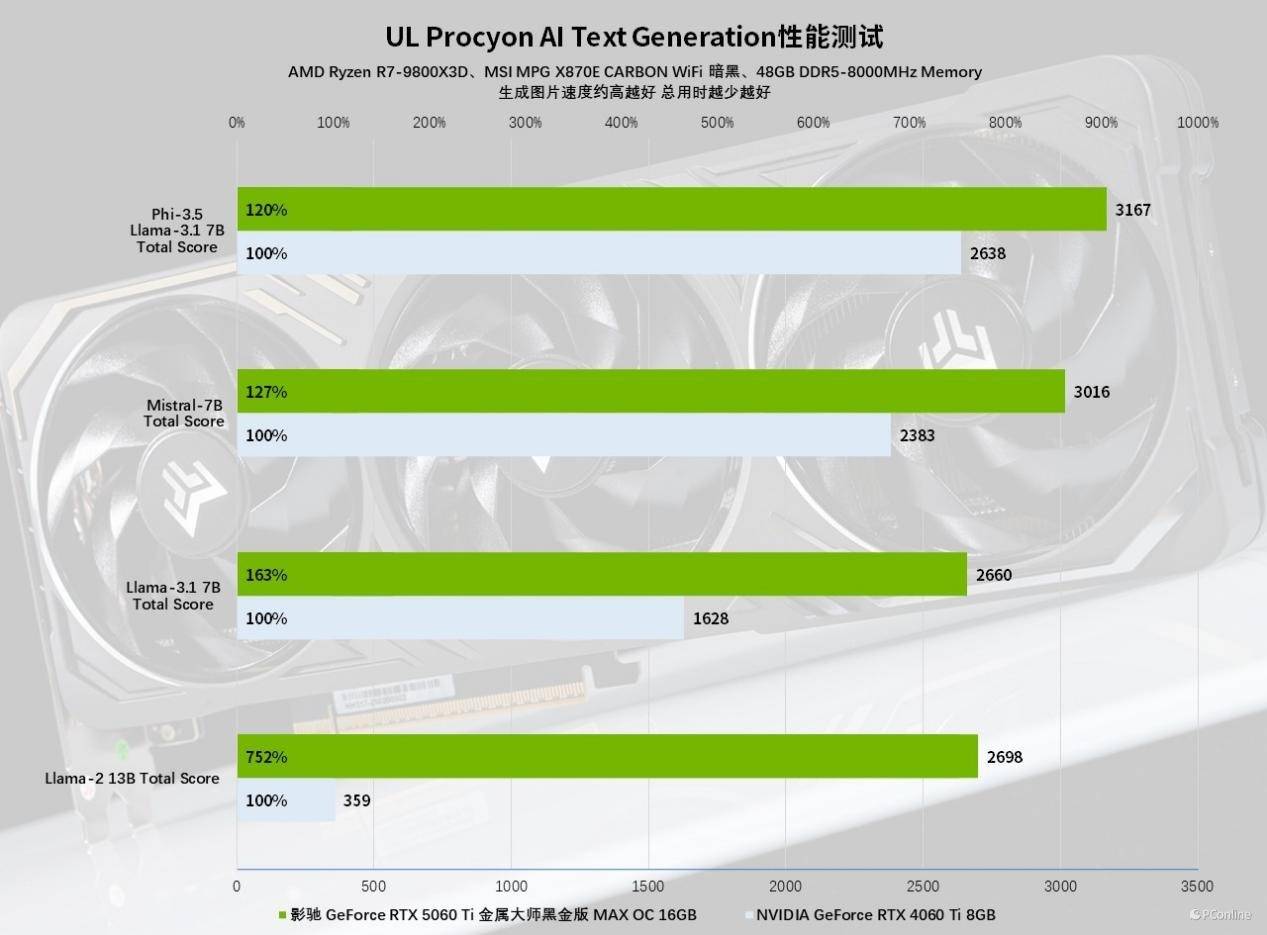 此外,我们还使用UL Procyon的AI Text Generation测试了更多的大语言模型,影驰GeForce RTX 5060 Ti 金属大师黑金版 MAX OC 16GB的优势依然显著。在基于Llama 3.1 7B LLM打造的Phi-3.5测试中,该显卡取得了3167分的优异成绩,相比RTX 4060 Ti提升了20%。当测试扩大至13B参数的Llama 2时,影驰GeForce RTX 5060 Ti 金属大师黑金版 MAX OC 16GB依然能够流畅应对,而RTX 4060 Ti由于显存限制,回答速度极慢,几乎无法正常使用,整体性能被RTX 50系显卡远远甩在后面,差距高达7.5倍以上。