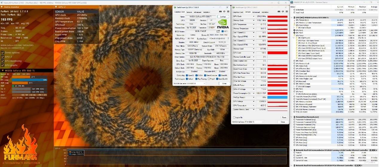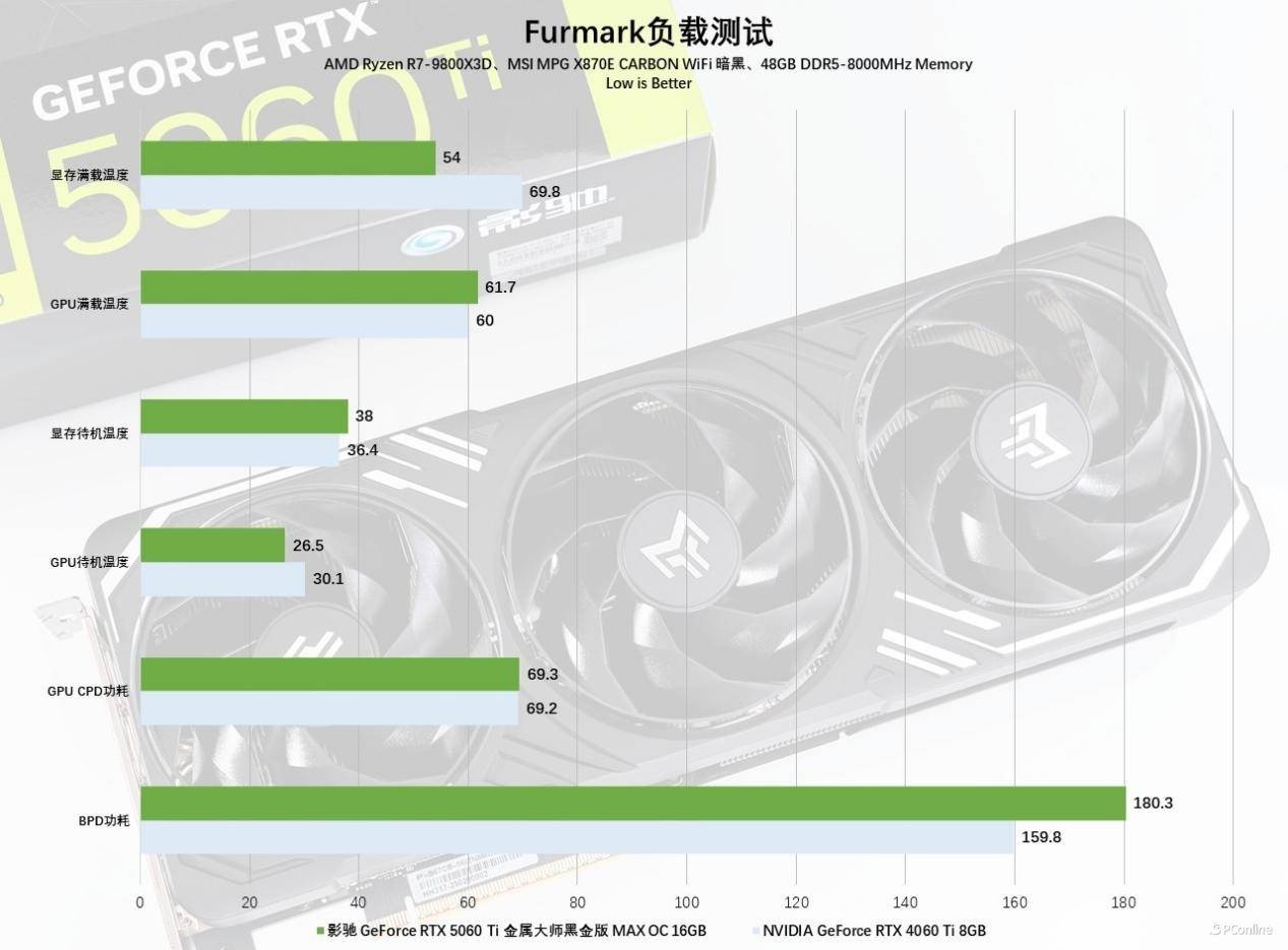 最后一项测试烤机,这也是许多玩家关注的重点。得益于影驰GeForce RTX 5060 Ti 金属大师黑金版 MAX OC 16GB出色的散热配置,整体表现非常出色。在室温20℃下,Furmark烧机10分钟后,整张显卡的温度并不高,核心仅有61.7度,显存温度更是低至54度,此时显卡的最大功率为180W,风扇转速也维持在1600 RPM左右,几乎听不到噪音。