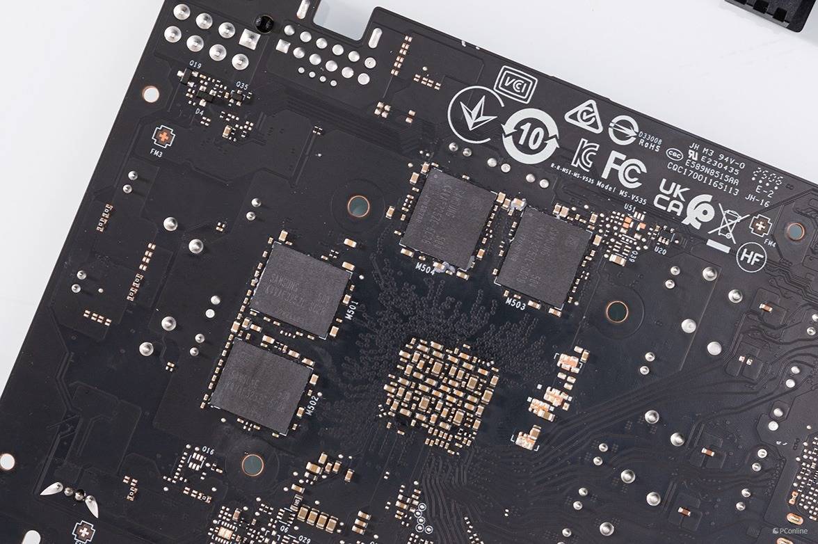 PCB的背部还有4颗GDDR7显存芯片,同样是单颗2GB,正反两面共组成了这款显卡的16GB超大显存配置。