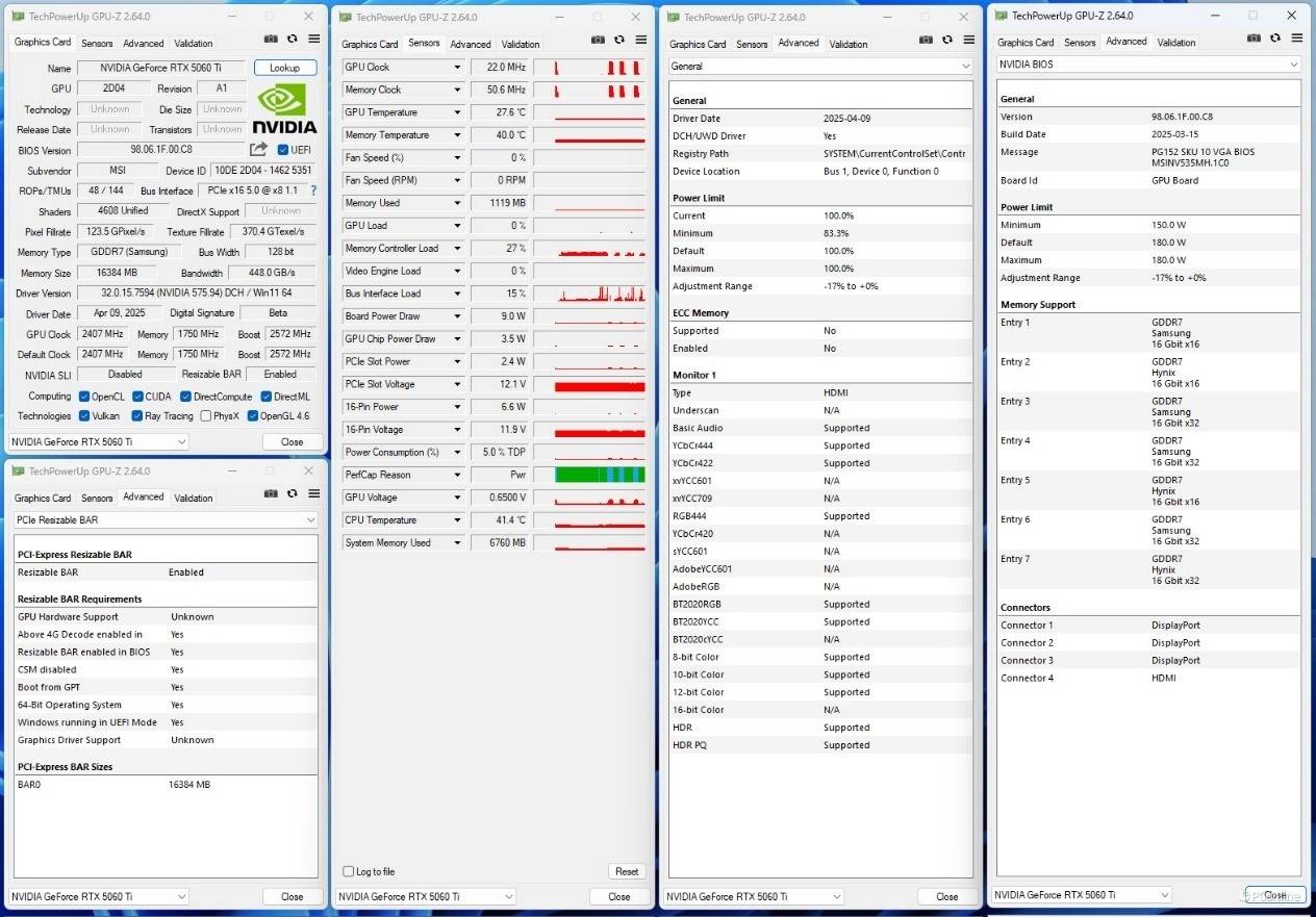 开始测试前,照例还是要“认识”一下这张显卡。从GPU-Z的信息中可以看到微星GeForce RTX 5060 Ti INSPIRE 2X 硬派师16GB的基准频率为2407MHz,Boost频率为2572MHz,这个频率对比前代RTX 4060 Ti的话,可以说提升了不少。除此之外,这张显卡的TDP也比前代稍高一些,为180W。并且换装了更高级的GDDR7显存,能够带来448GB/s的显存带宽。