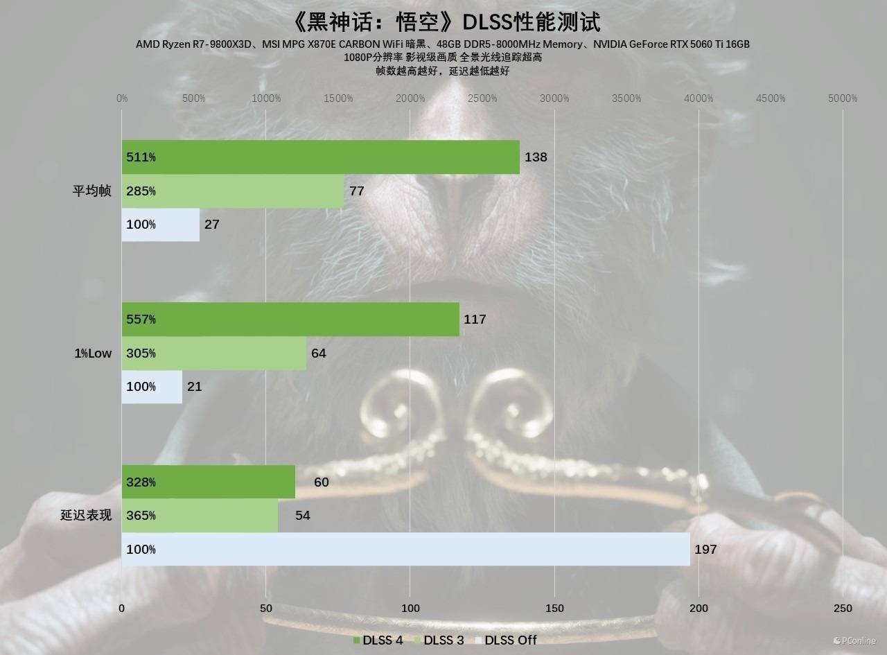 见识完Transformer模型的魅力以后,我们再来看DLSS 4的性能表现,毕竟是“显卡杀手”,对显卡的压力确实不一般,在最高画质+路径追踪的情况下,微星GeForce RTX 5060 Ti INSPIRE 2X 硬派师16GB只能跑29 FPS,完全不可玩。开启DLSS 3以后,游戏帧数为100 FPS,体感已经非常流畅了。开启DLSS 4以后,微星GeForce RTX 5060 Ti INSPIRE 2X 硬派师16GB能够做到183 FPS,对比原生分辨率,性能足足提升了6.3倍。1%Low就更离谱了,几乎快要追上DLSS 3下的平均帧了,整体游戏体验更佳。
